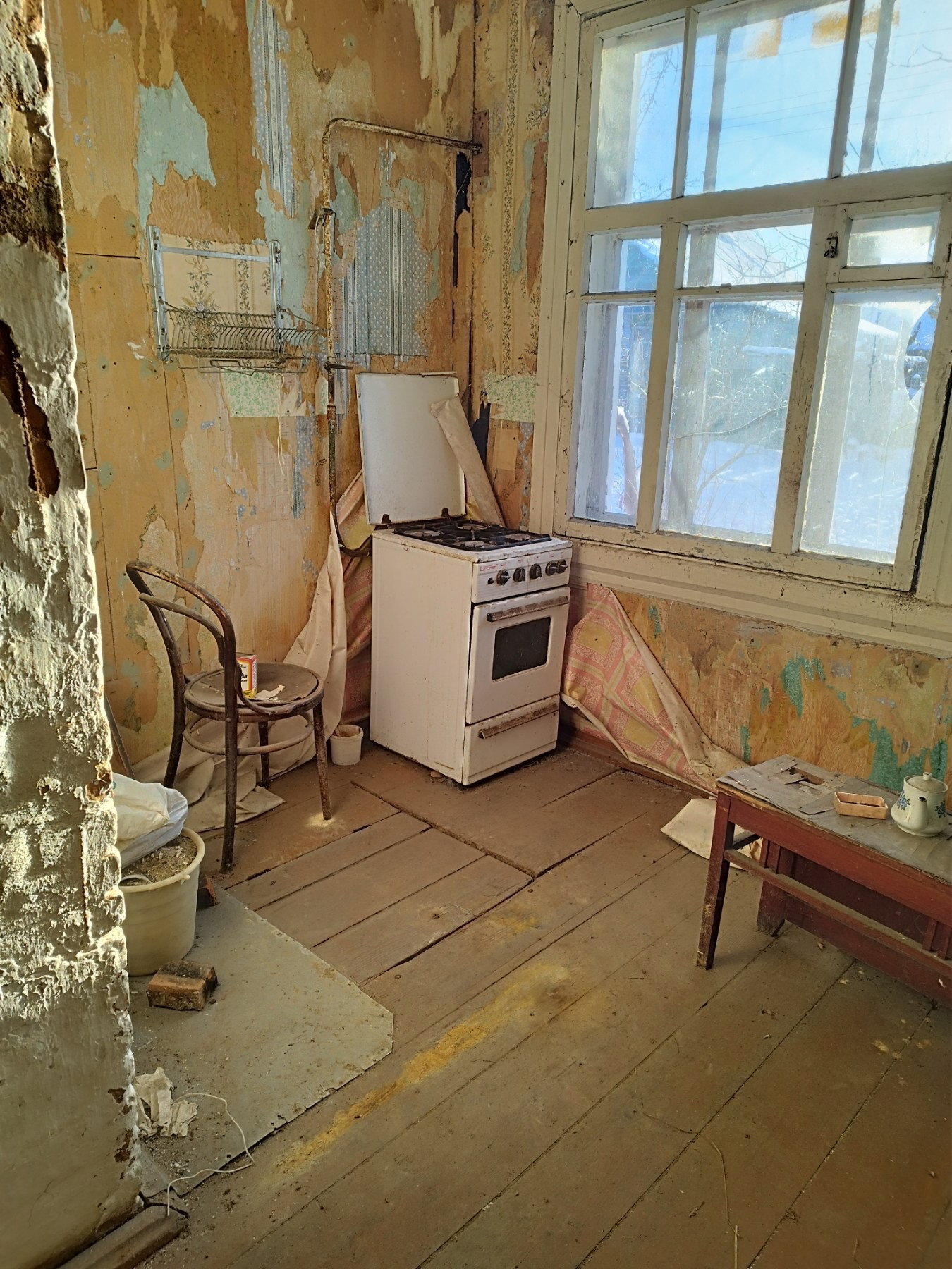 В квартиру заведены газ, электричество, водопровод и канализация, но не подключены. Имеется рабочая печка.