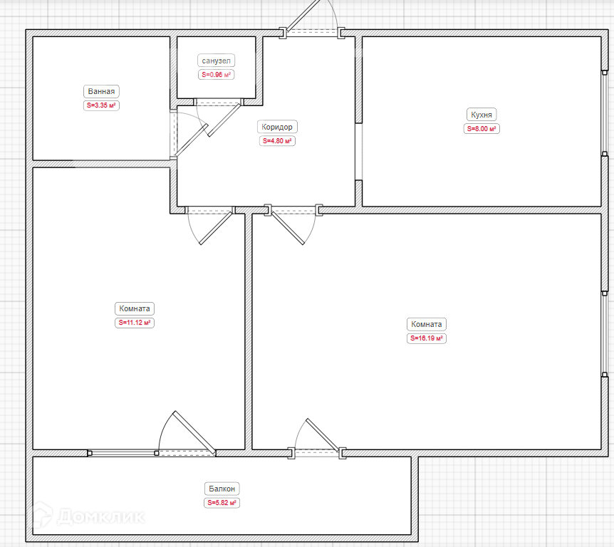 Площадь объекта 48.1м2. Высота потолка 2,7м. Кухня 8м2. Комната 16,2м2. Комната 11,1м2.