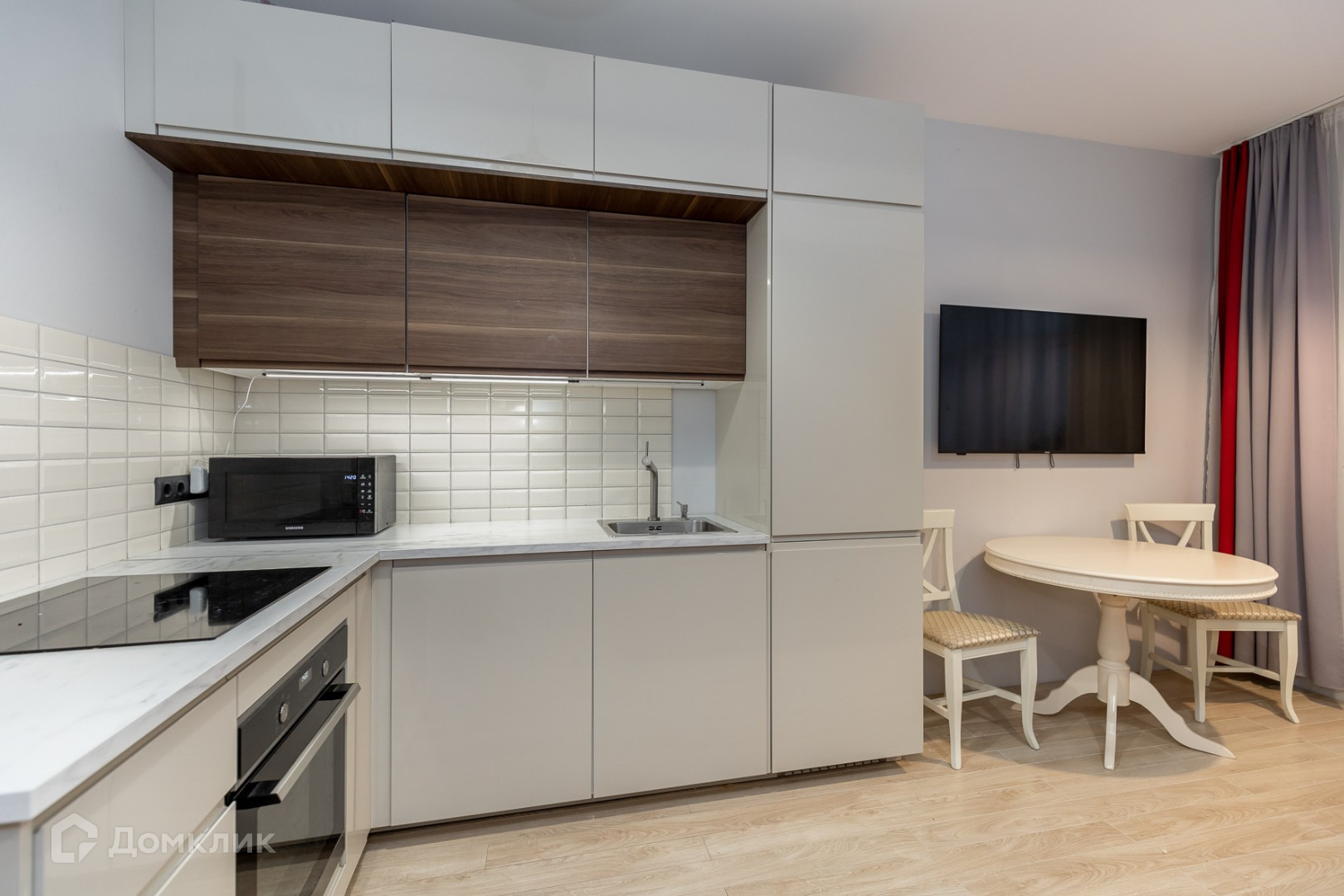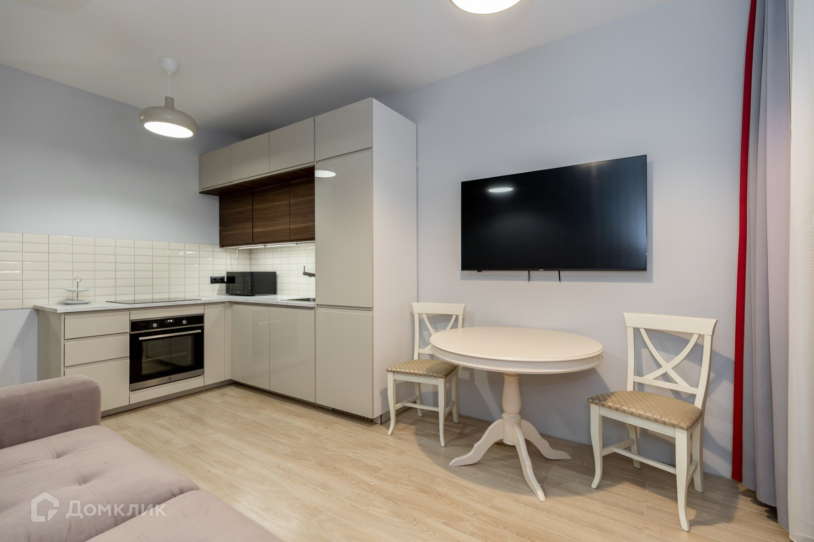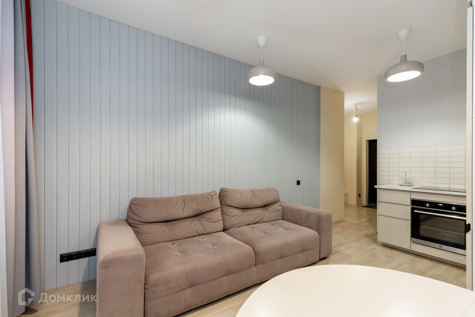 Эргономичная планировка с большой гардеробной и кухней-гостиной.