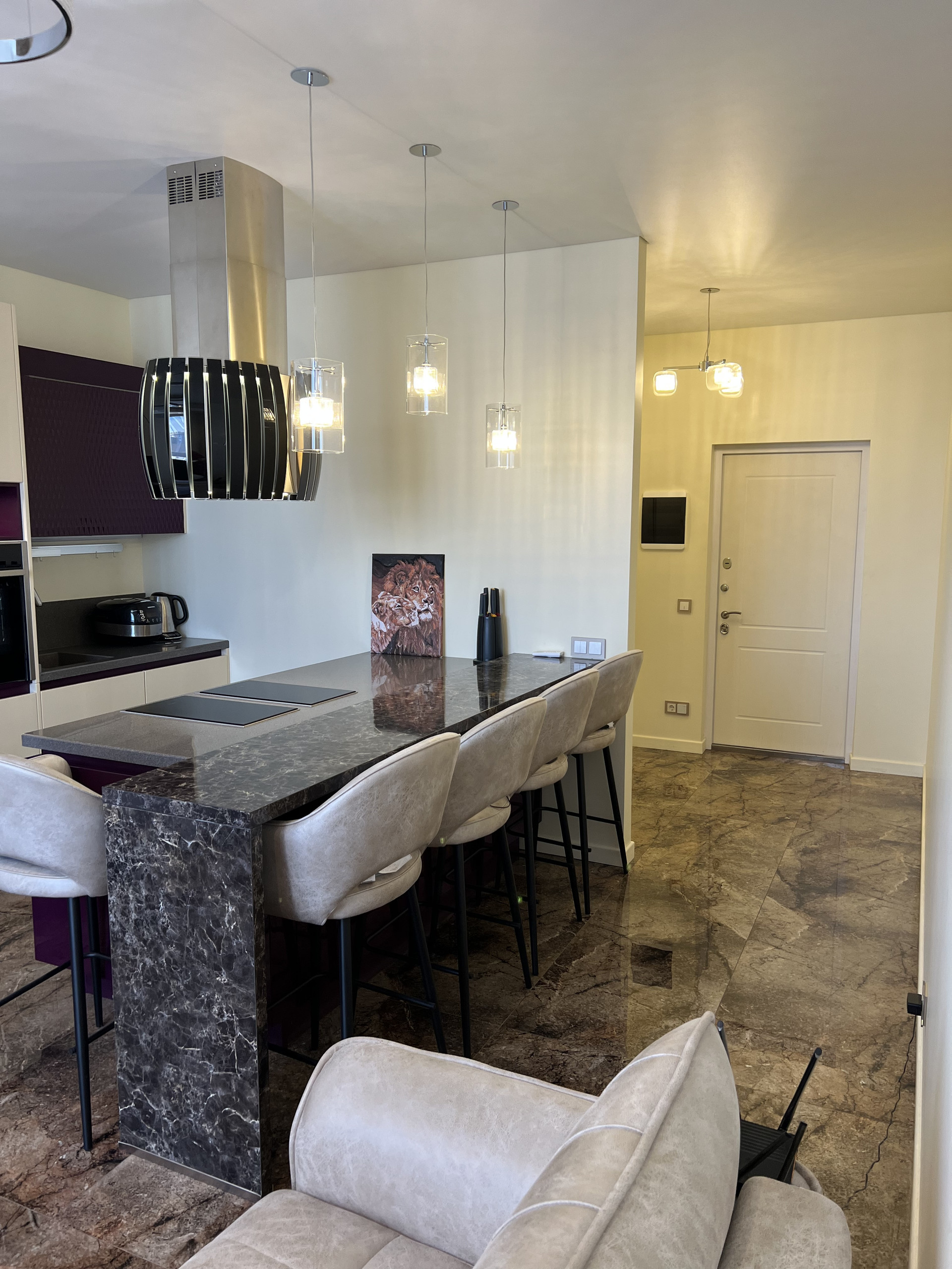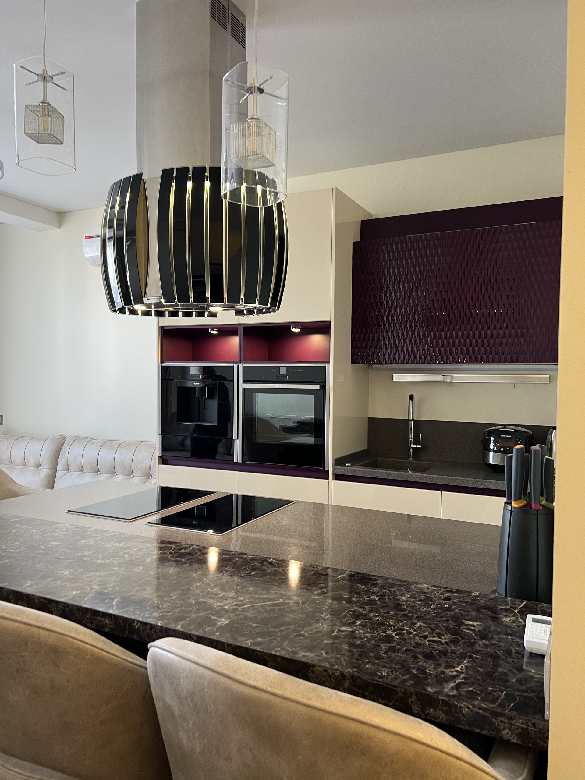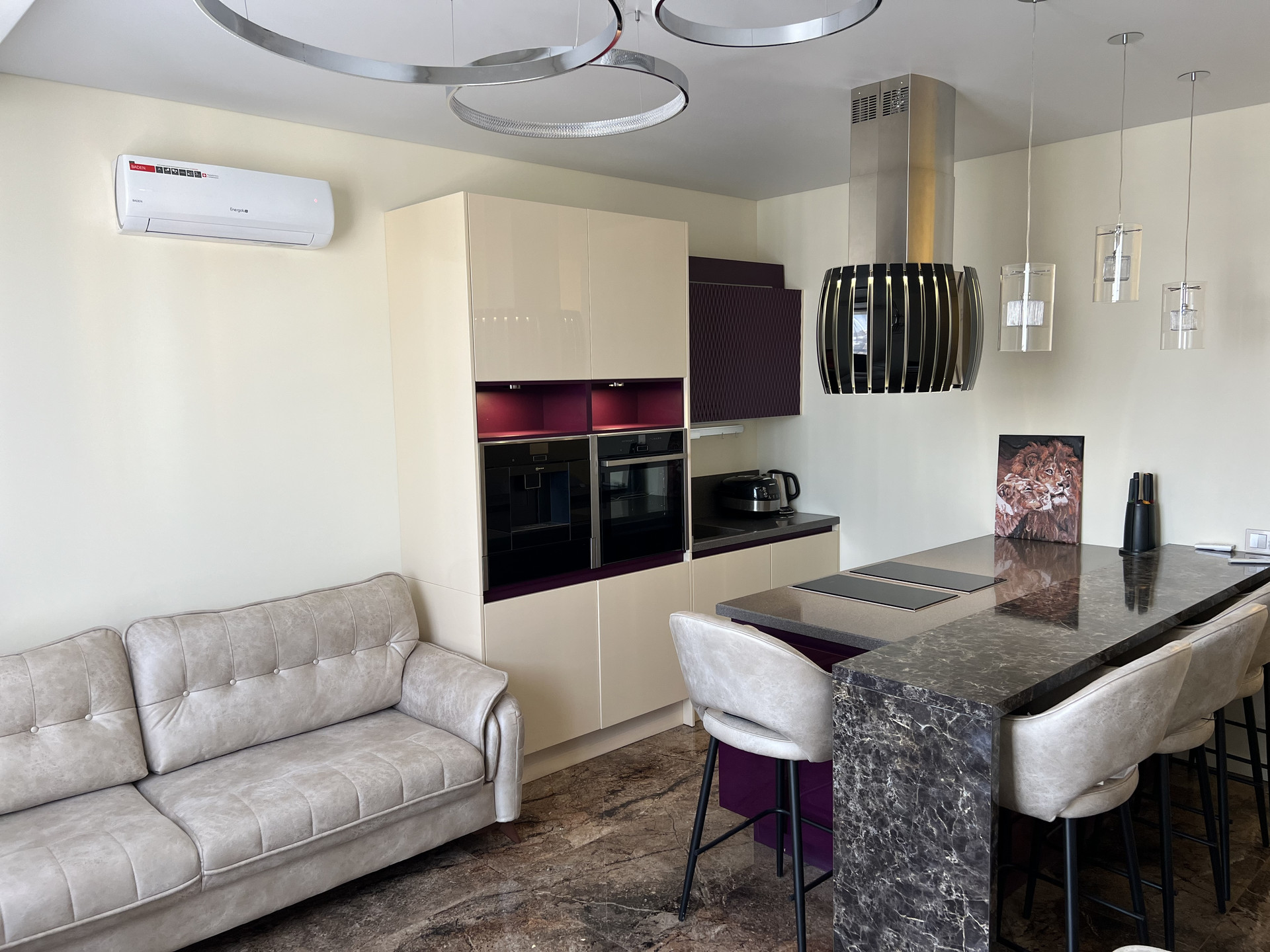 Кухонный гарнитур на гарантии , фасады -эмаль, столешница камень , дизайнерская итальянская вытяжка , техника Neff , микролифт , встраиваемая кофе машина , подогрев посуды , духовка с функцией свч, индукционная плита , кондиционер, телевизор, встроенный холодильник, стиральная машина .