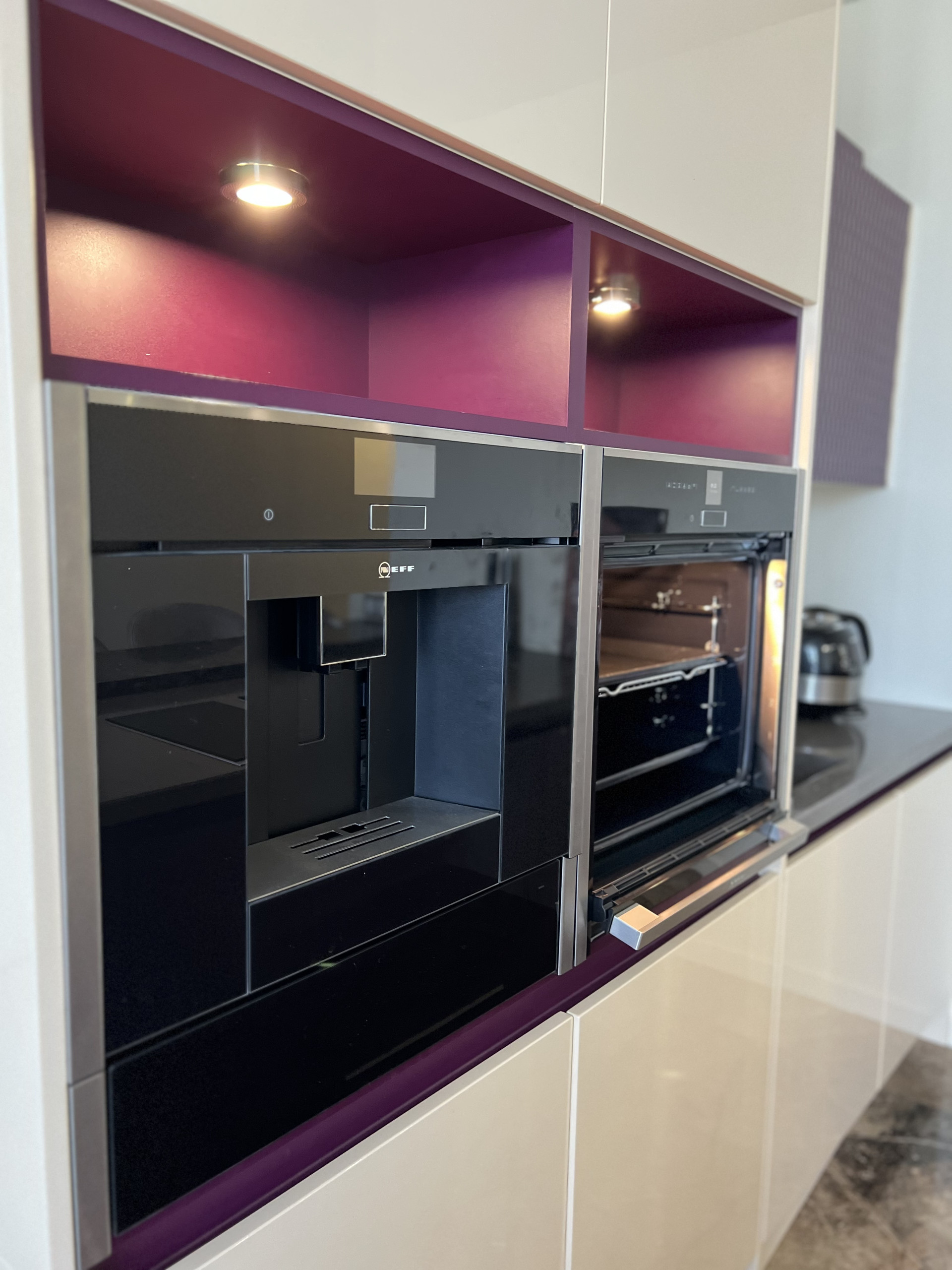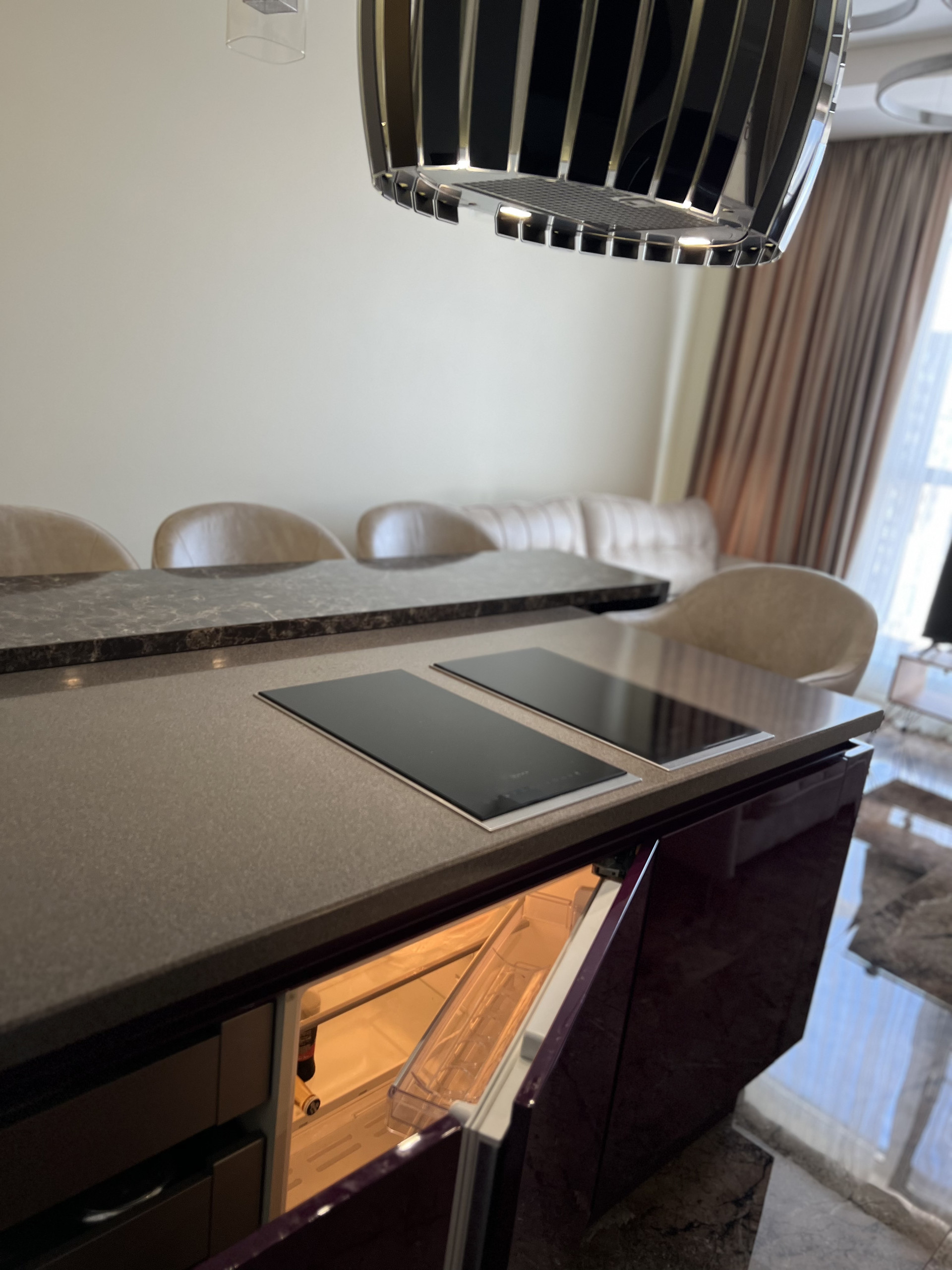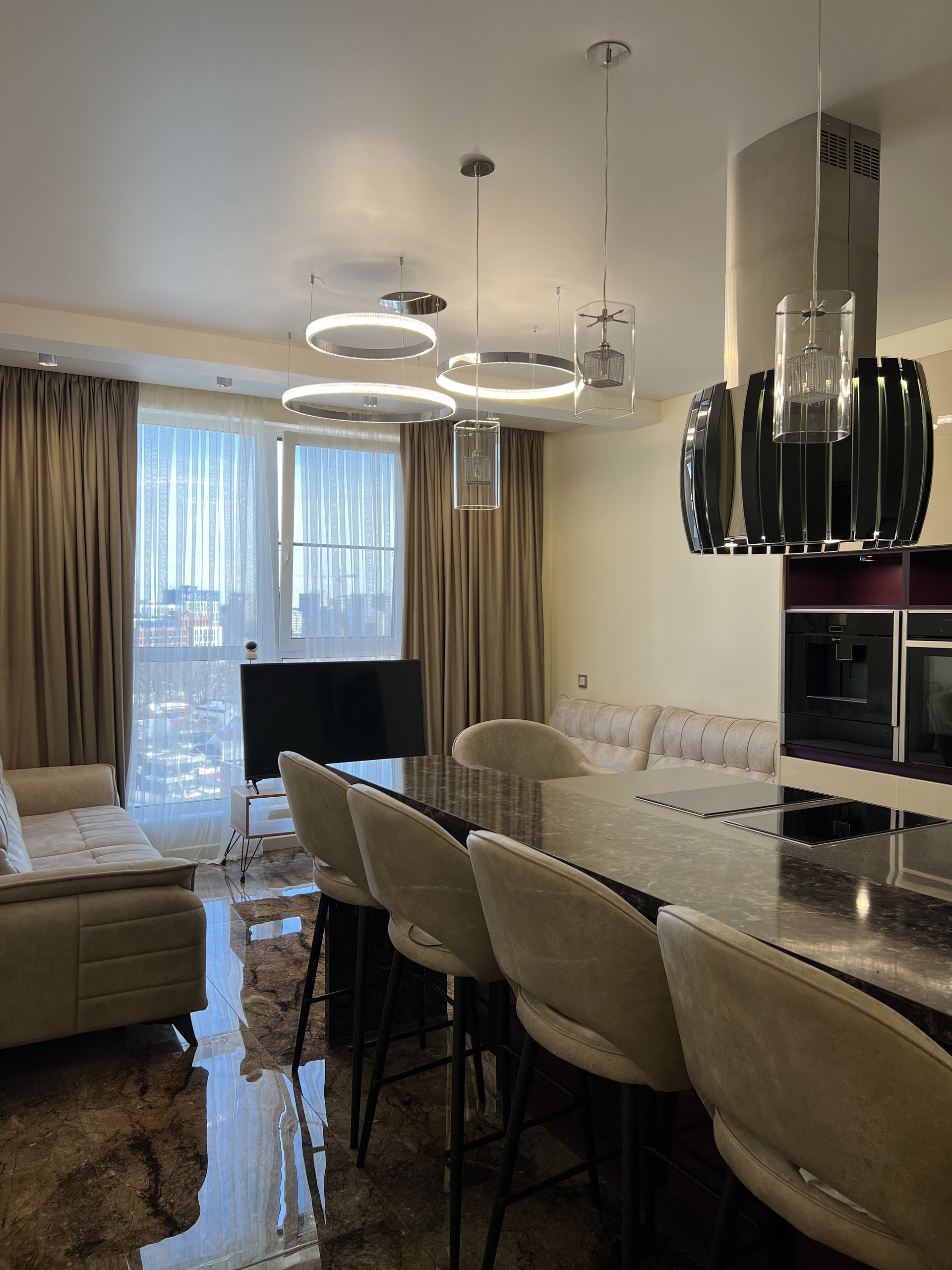 Кухонный гарнитур на гарантии , фасады -эмаль, столешница камень , дизайнерская итальянская вытяжка , техника Neff , микролифт , встраиваемая кофе машина , подогрев посуды , духовка с функцией свч, индукционная плита , кондиционер, телевизор, встроенный холодильник, стиральная машина .