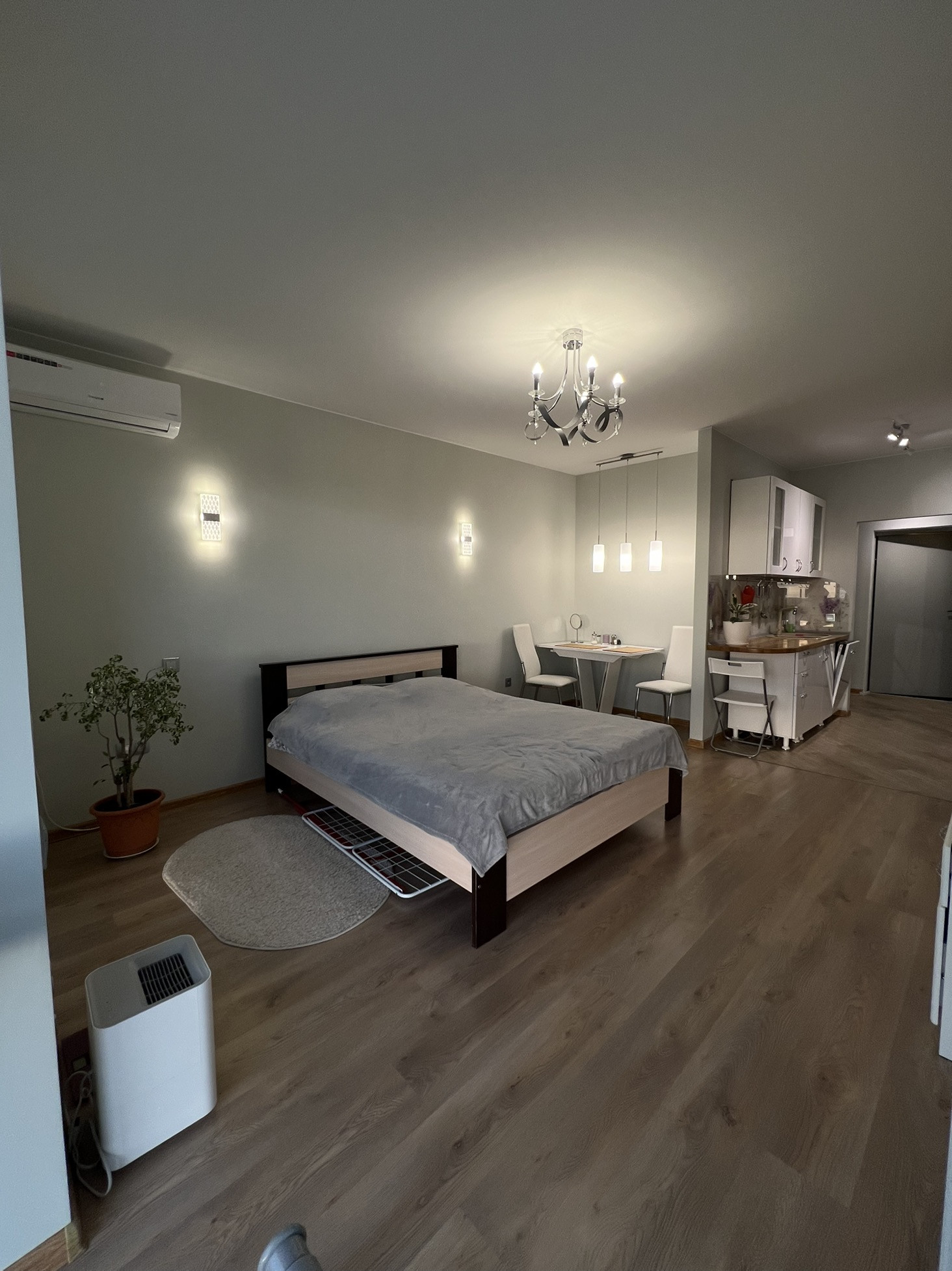 Квартира-студия, полностью оборудована, мебелью и техникой. А именно: кондиционер,стиральная машинка,духовой шкаф, плита,холодильник,псодумоечная машина, водонагреватель бойлерного типа, кухонный гарнитур,встроенный шкаф купе, стенка.