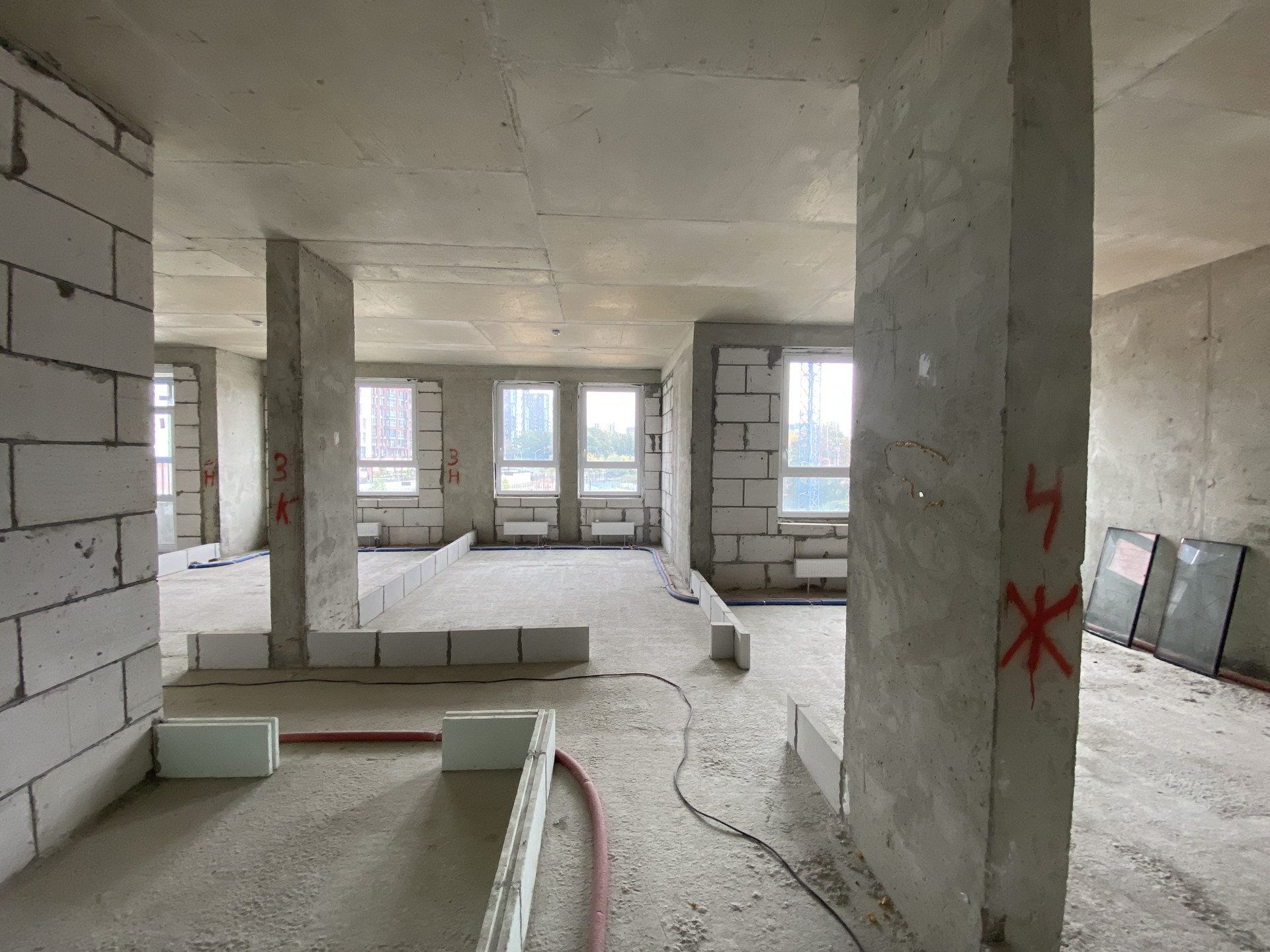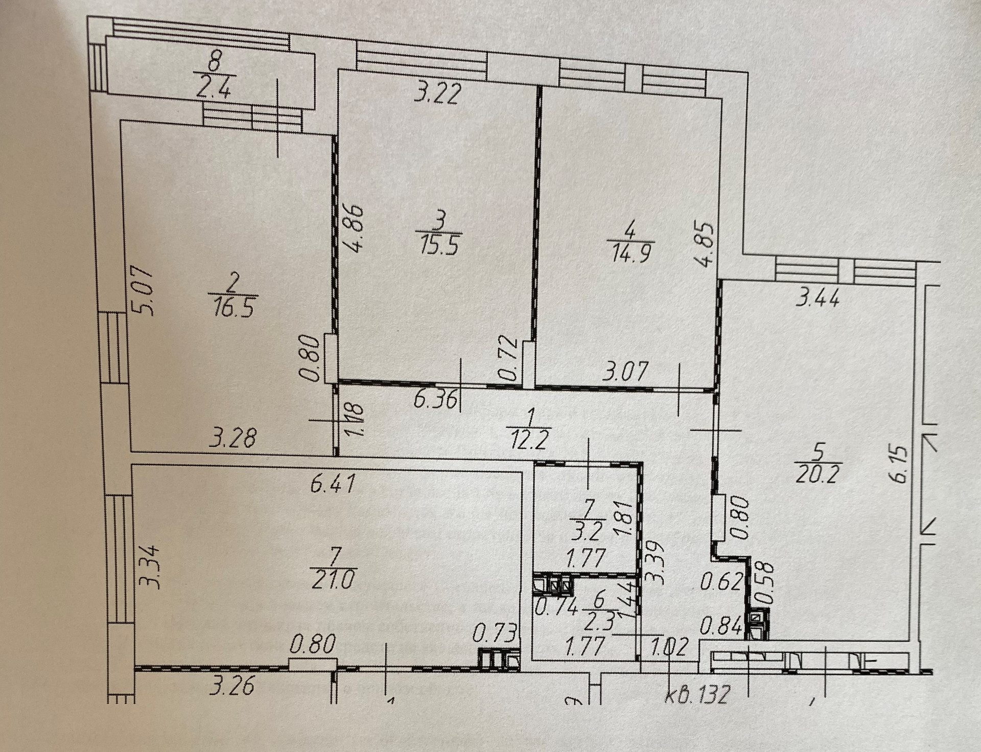 Большие окна в комнатах, потолки 3 м.