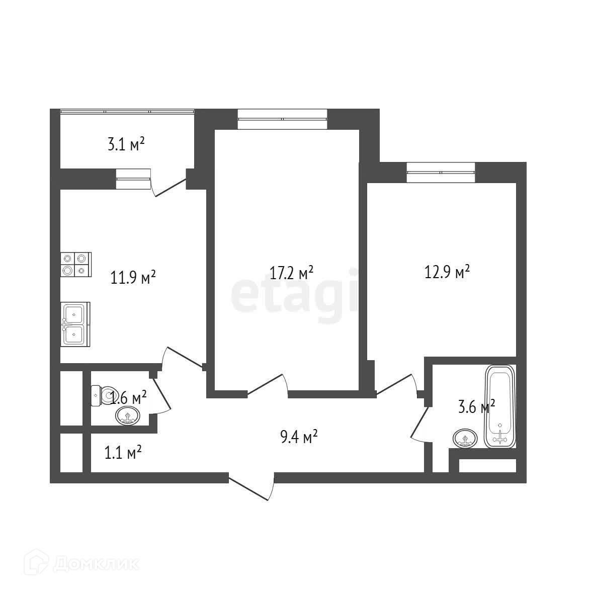 В квартире: жилая комната 17,2 м2, спальня 12.9 м2, кухня 11,9 м2 с выходом на большую 3.1 м2 лоджию, прихожая 9.7 м2, два с/у.