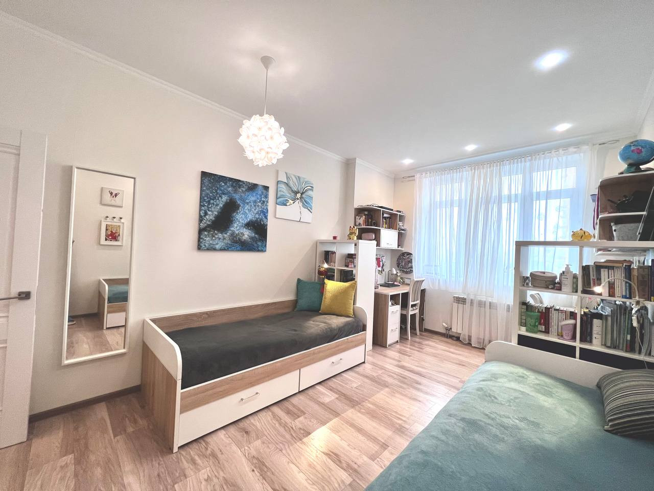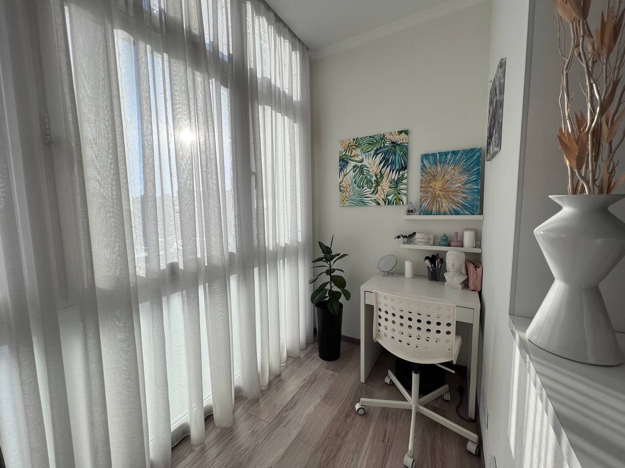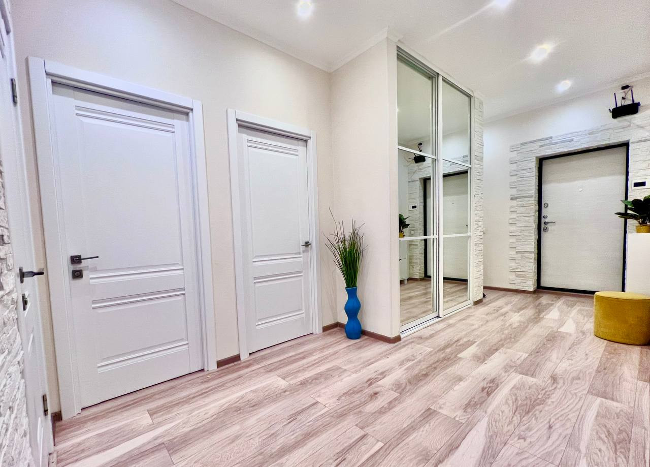 Трехкомнатная квартира с самой удачной планировкой - распашонка - на две стороны. Квартира с отличным ремонтом, в ремонте использовали только качественные дорогие материалы. Современная отделка в светлых тонах еще долго будет оставаться актуальной. Мебель частично остается, обсуждается с покупателем по ситуации. В прихожей и комнате встроенные шкафы-купе до потолка, выполненные в одном стиле. Шкафы были выполнены на заказ. Кухня с большим кол-вом шкафов в стиле минимализм. Один балкон выходит на отлично обустроенный двор, второй на парковую зону.