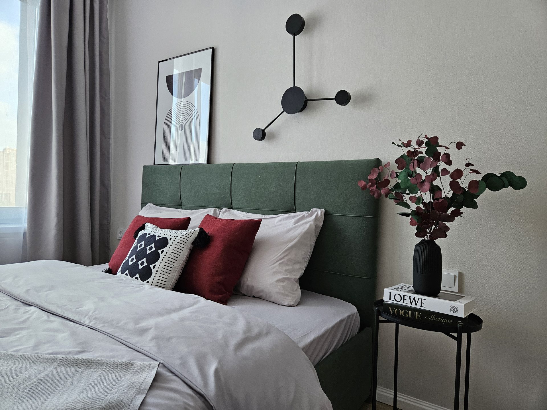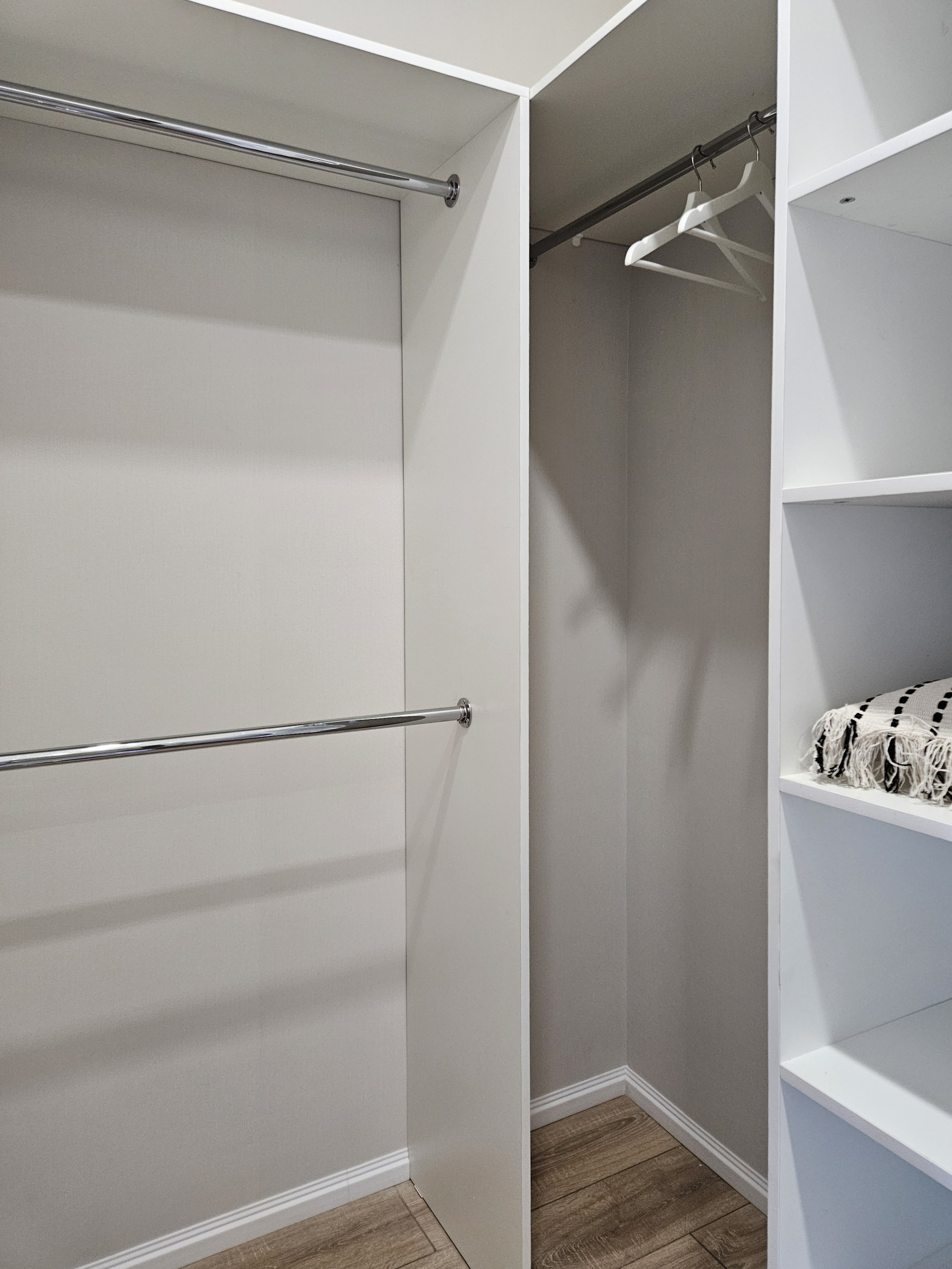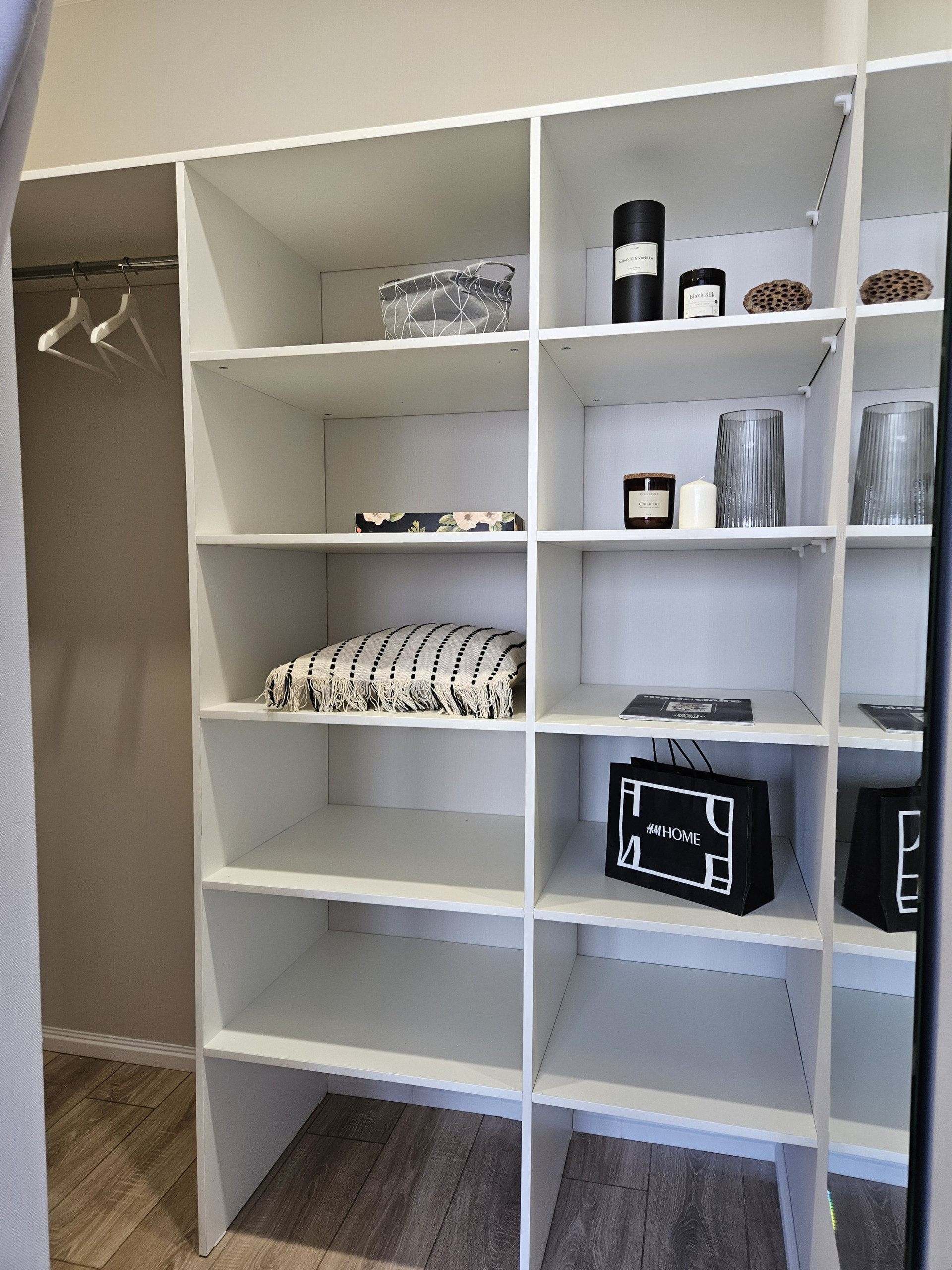 В комнате выделены спальная и рабочая зоны. Оборудована гардеробная, сделанная на заказ (ЛДСП Egger).