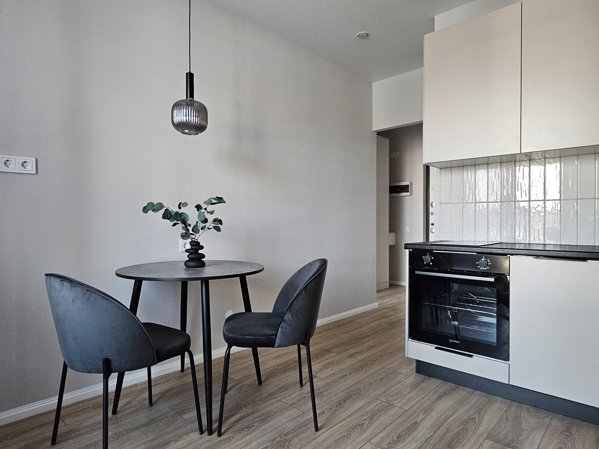Кухня 10,3 кв м. Гарнитур с новой встроенной техникой на гарантии (холодильник, посудомоечная машина, духовой шкаф, электрическая варочная панель), стильная обеденная группа + небольшой диван для организации ТВ-зоны.