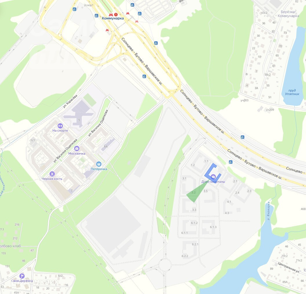 ЖК «Дзен-кварталы» возводится на юго-западе столицы - вдоль береговой линии Ивановского пруда и реки Варварки в окружении зеленых зон. Это 6 кирпично-монолитных корпусов. От жилого комплекса до метро "Коммунарка" 15 минут пешком; 7,5 км до МКАД.