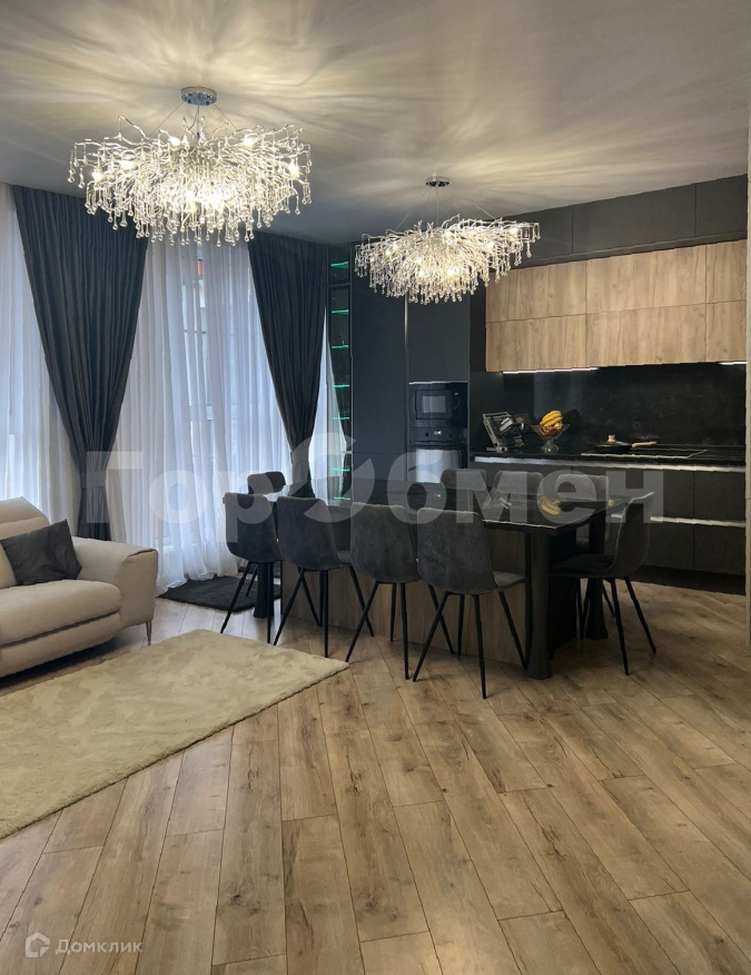 Квартира меблирована корпусной кухонной мебелью, обеденной группой, встроенными шкафами, оборудована кондиционерами, бойлерами. В комплектации кухни использована бытовая техника от ведущих производителей. Столешница рабочей зоны и обеденной группы - из искусственного камня. При оформлении световых сценариев использованы люстры и светильники актуального современного дизайна. Оформление стен в нейтральной цветовой гамме, напольное покрытие – керамогранит (с подогревом) в зоне прихожей, санузлов, кухни, столовой, гостиной, в жилых комнатах – ламинат.