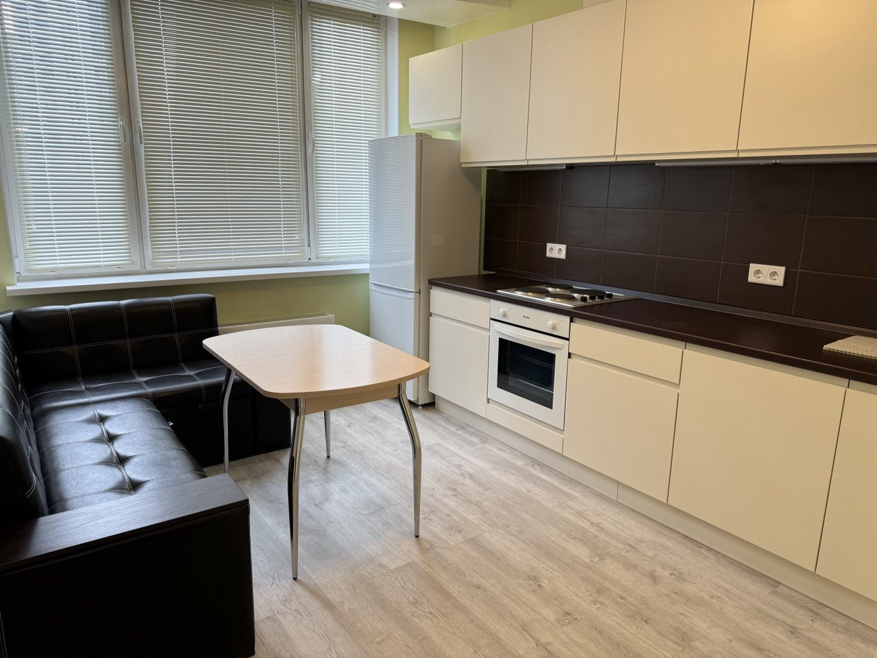 Кухонная мебель выполнена по индивидуальному заказу. Встроенная  стиральная машина, электро-плита, духовой шкаф, вытяжка, кондиционер. Вся мебель и бытовая техника  новые, остаются новому владельцу.