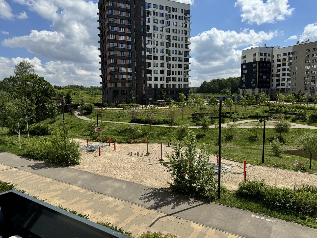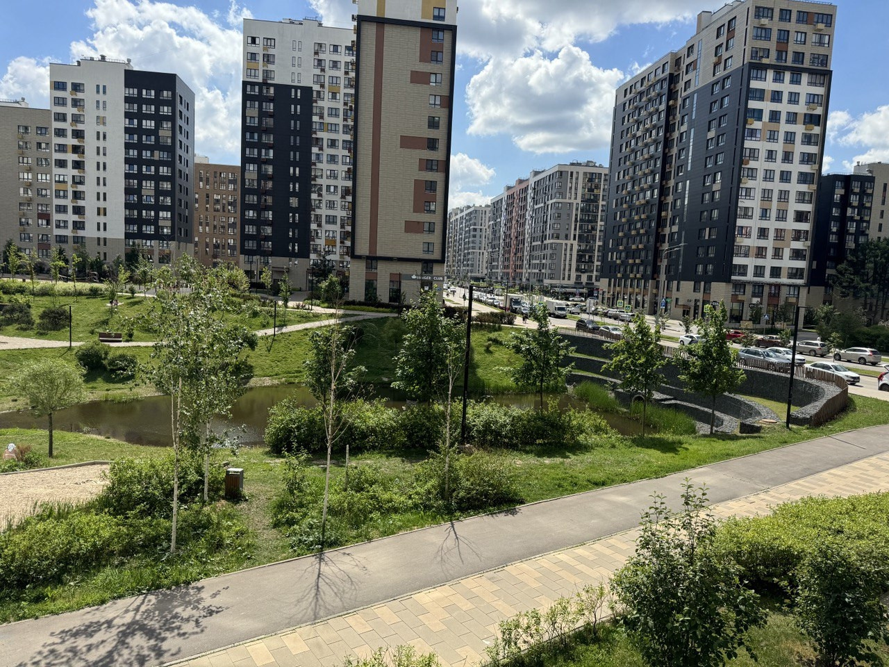 Потрясающий  вид  из окон  на парк и пруд  с  зоной  отдыха.