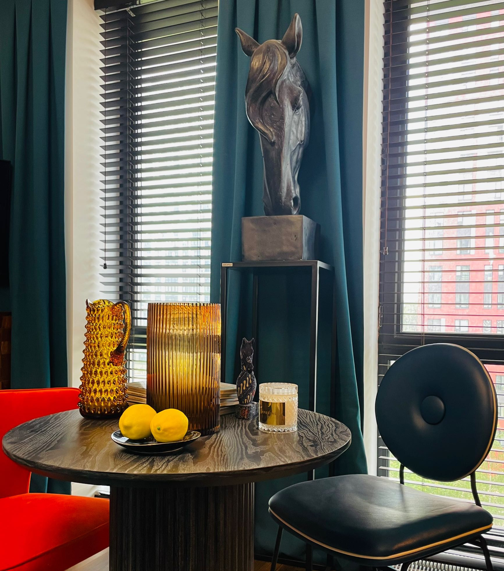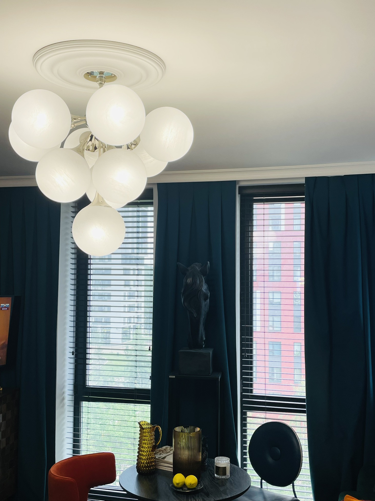 В зоне гостиной установлены панорамные окна с красивым видом на внутренний двор с парком.