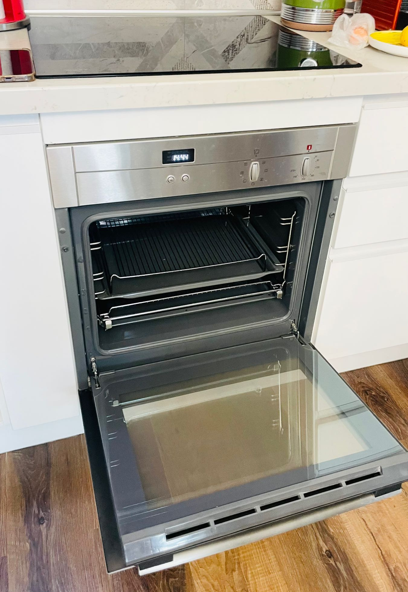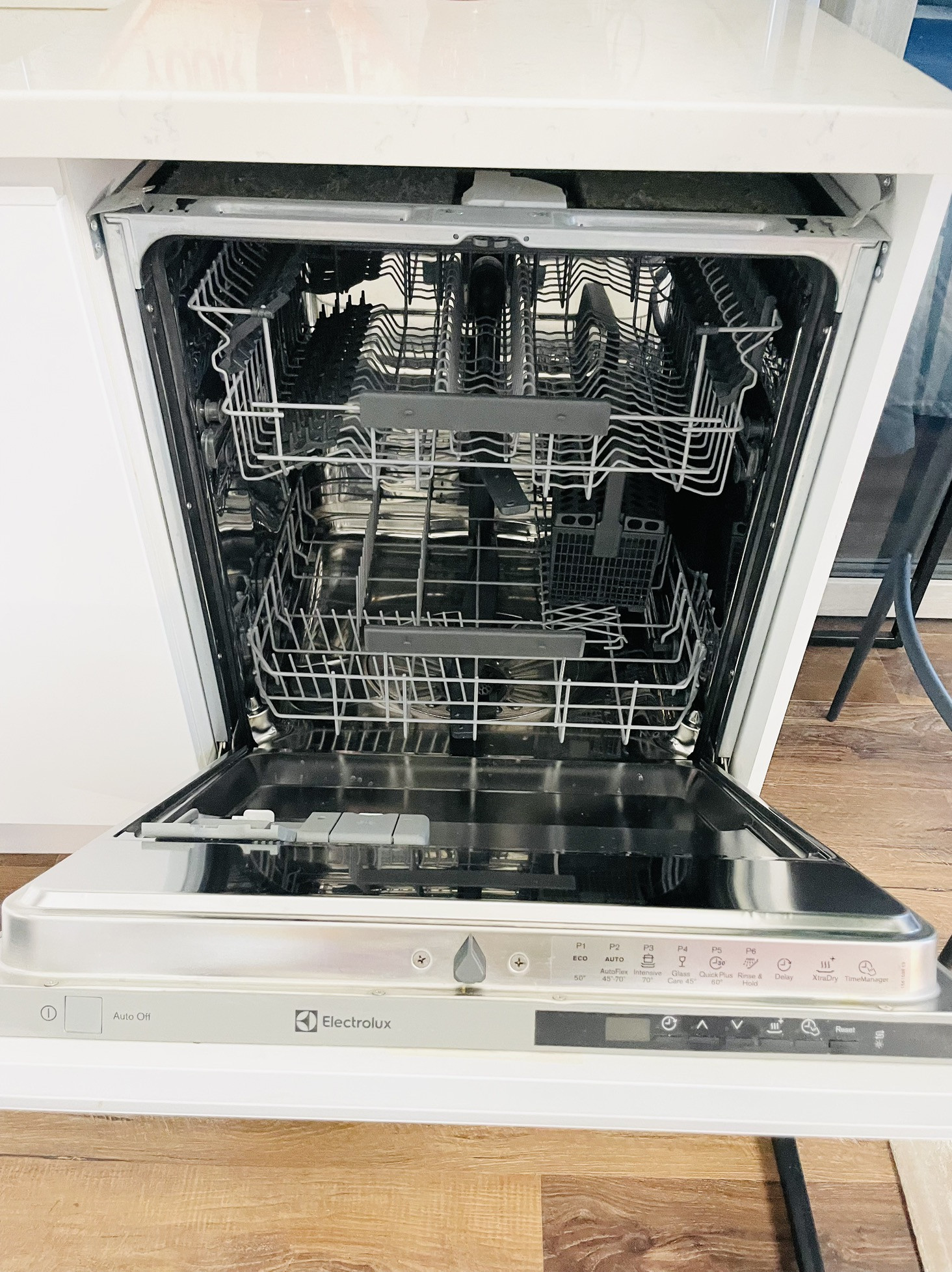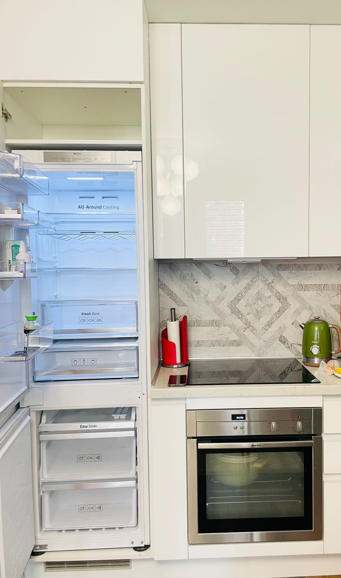 Кухня изготовлена по индивидуальному проекту со встроенным холодильником, варочной панелью, духовкой, вытяжкой и посудомойкой, столешница рабочей зоны и раковина изготовлены из искусственного камня.