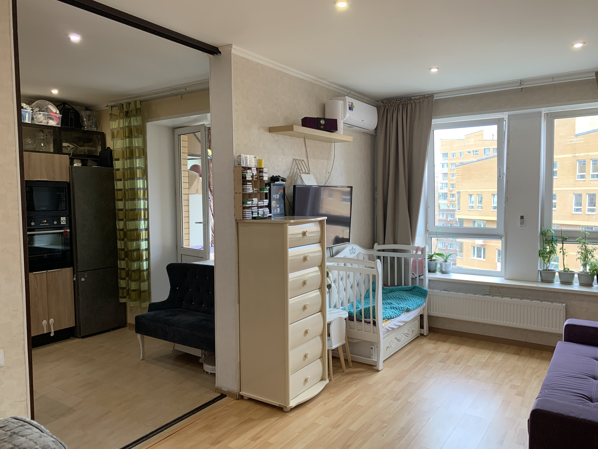 Paздвижныe двepи для зониpовaния,  пpoсторная прихожая, совмещенный санузел. В стоимость входит кондиционер, встроенная корпусная мебель-трансформер, кухня со встроенной бытовой техникой, посудомоечной машиной, инверторный кондиционер.