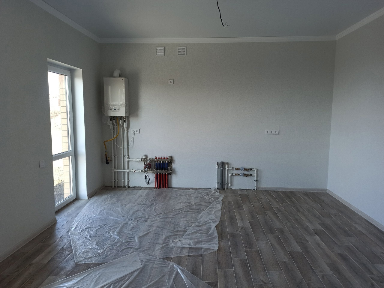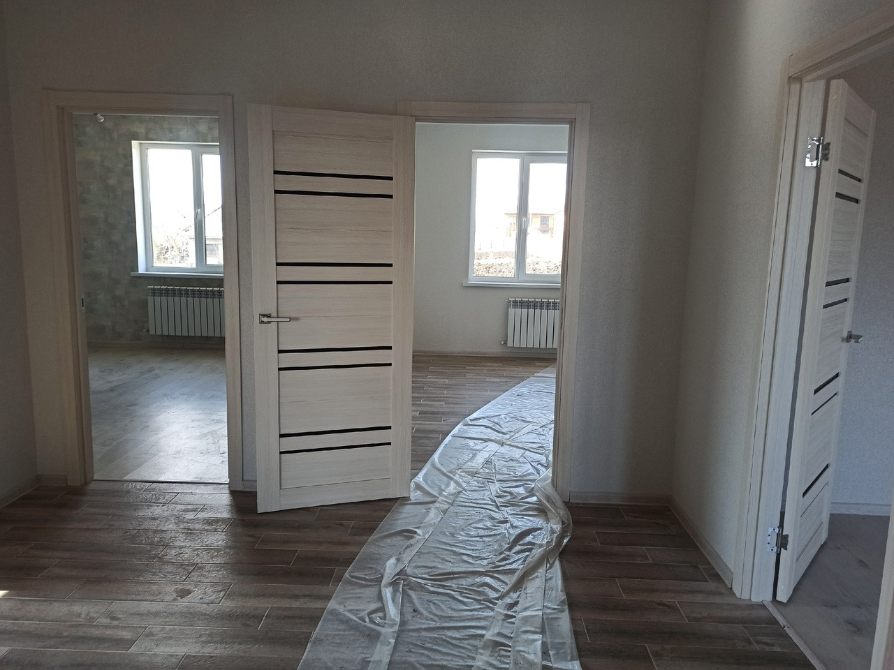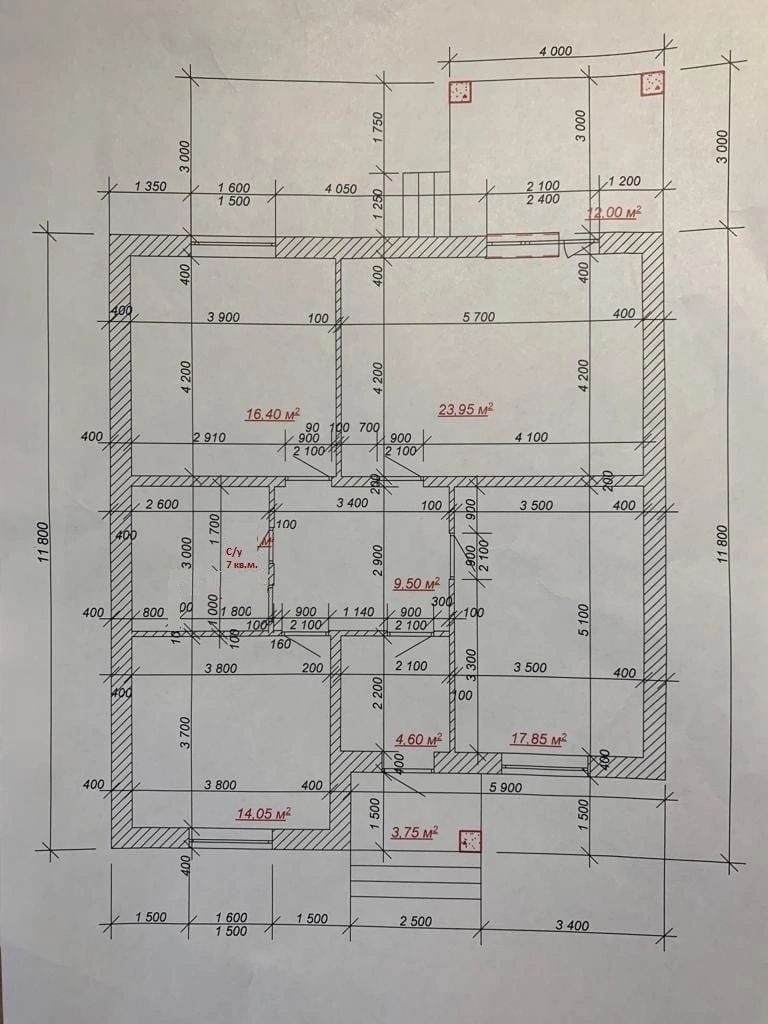 3 комнаты: 17,85; 14,05; 16,4 кв. м., кухня-столовая 23,95 кв .м. с выходом во двор (предполагалась терраса), совмещенный сан. узел 7 кв. м., входная группа 4,6 кв. м. и прихожая 9,5 кв. м.