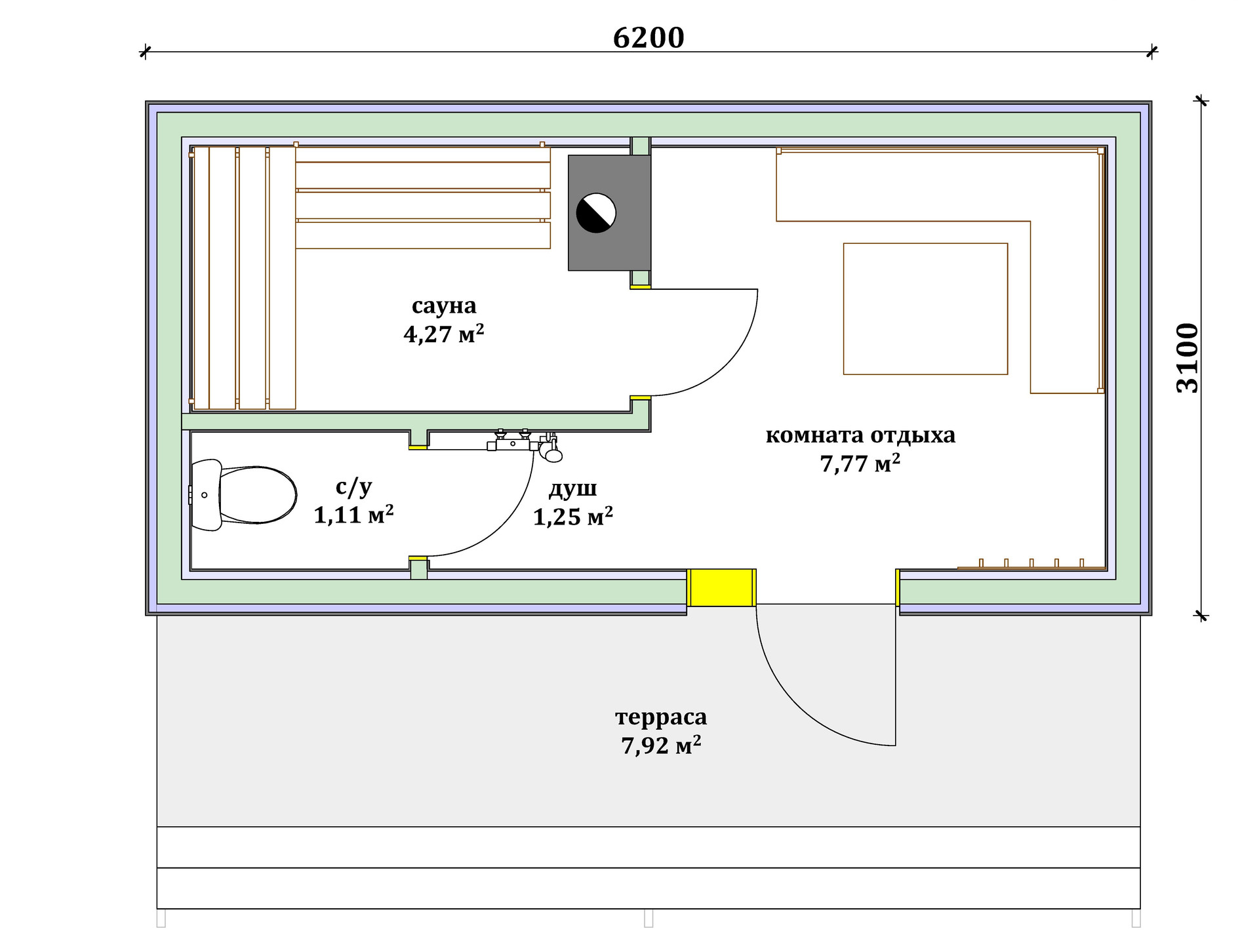 Размеры бани: длина 6.2 м высота 3.2 м, ширина 3.2