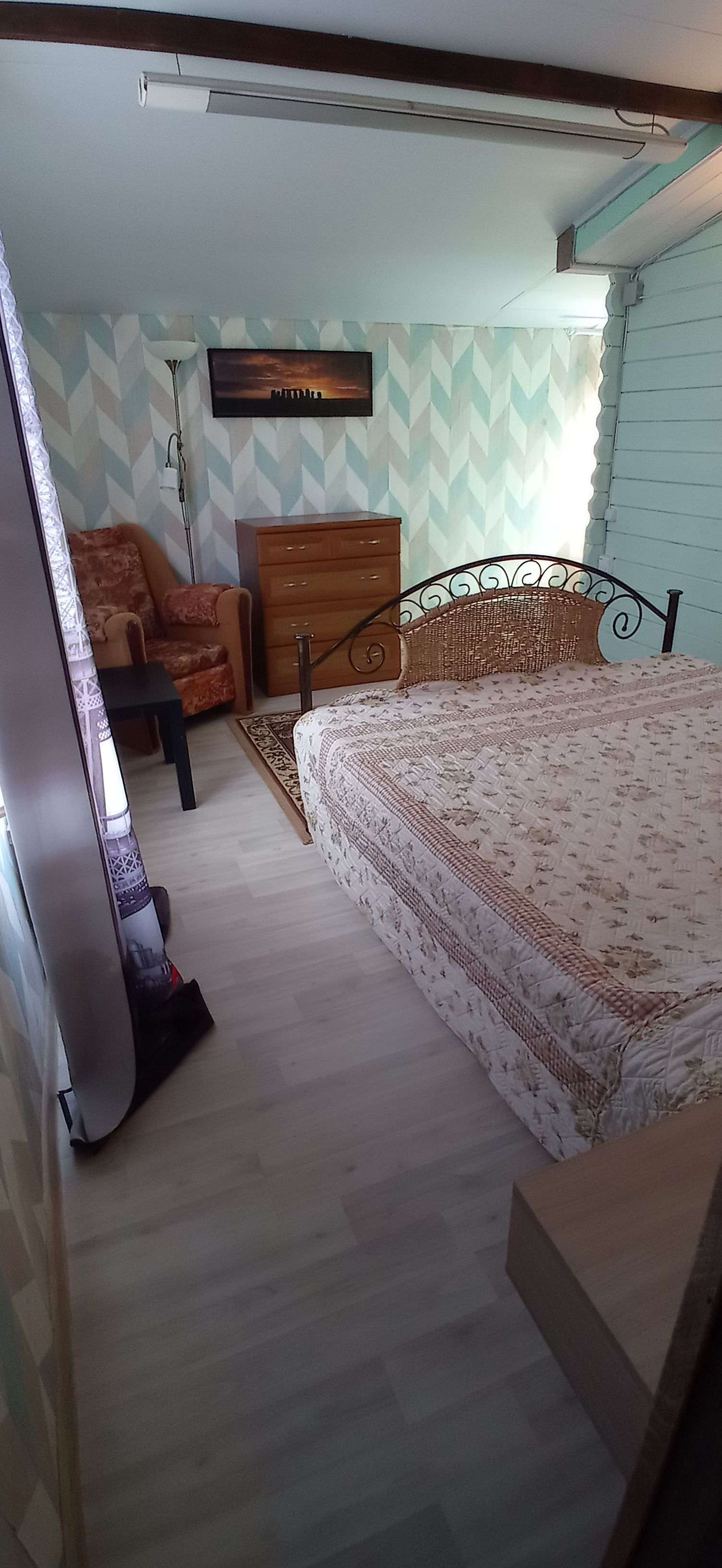 В спальне 2 х спальная кровать, гардеробная, комод.