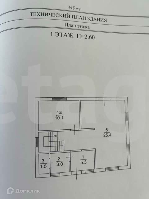 На 1 этаже расположены - кухня гостиная 25,4 кв.м., , коридор 12 кв.м, комната 10.1 кв.м., сан. узел 5.3 кв.м.