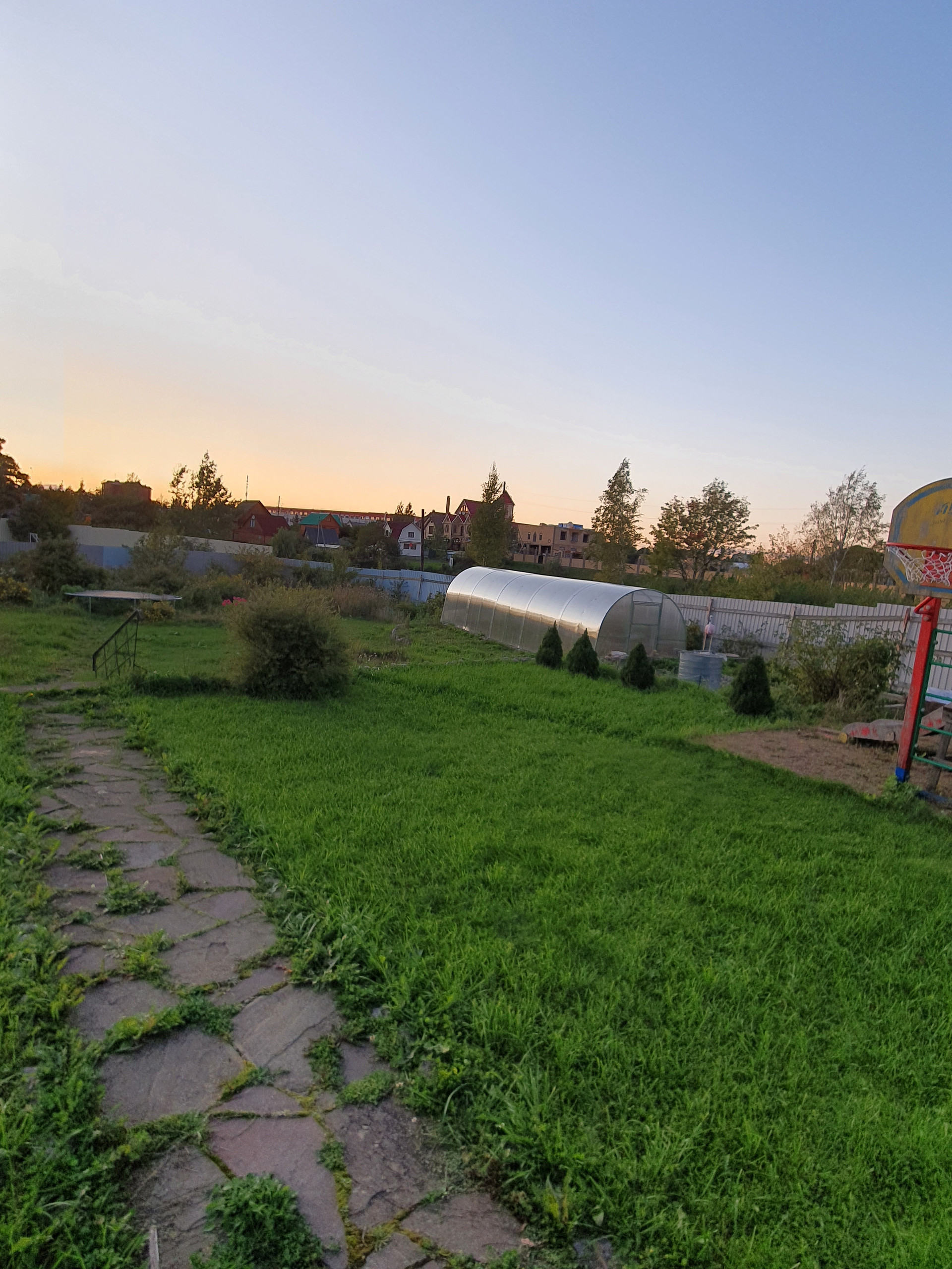 На участке пристройка для хранения инвентаря, теплица, подготовлен фундамент для бани или барбекю- павильона с подводкой всех сетей.
