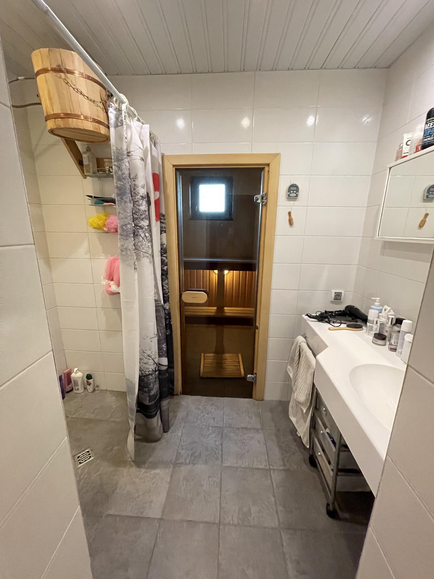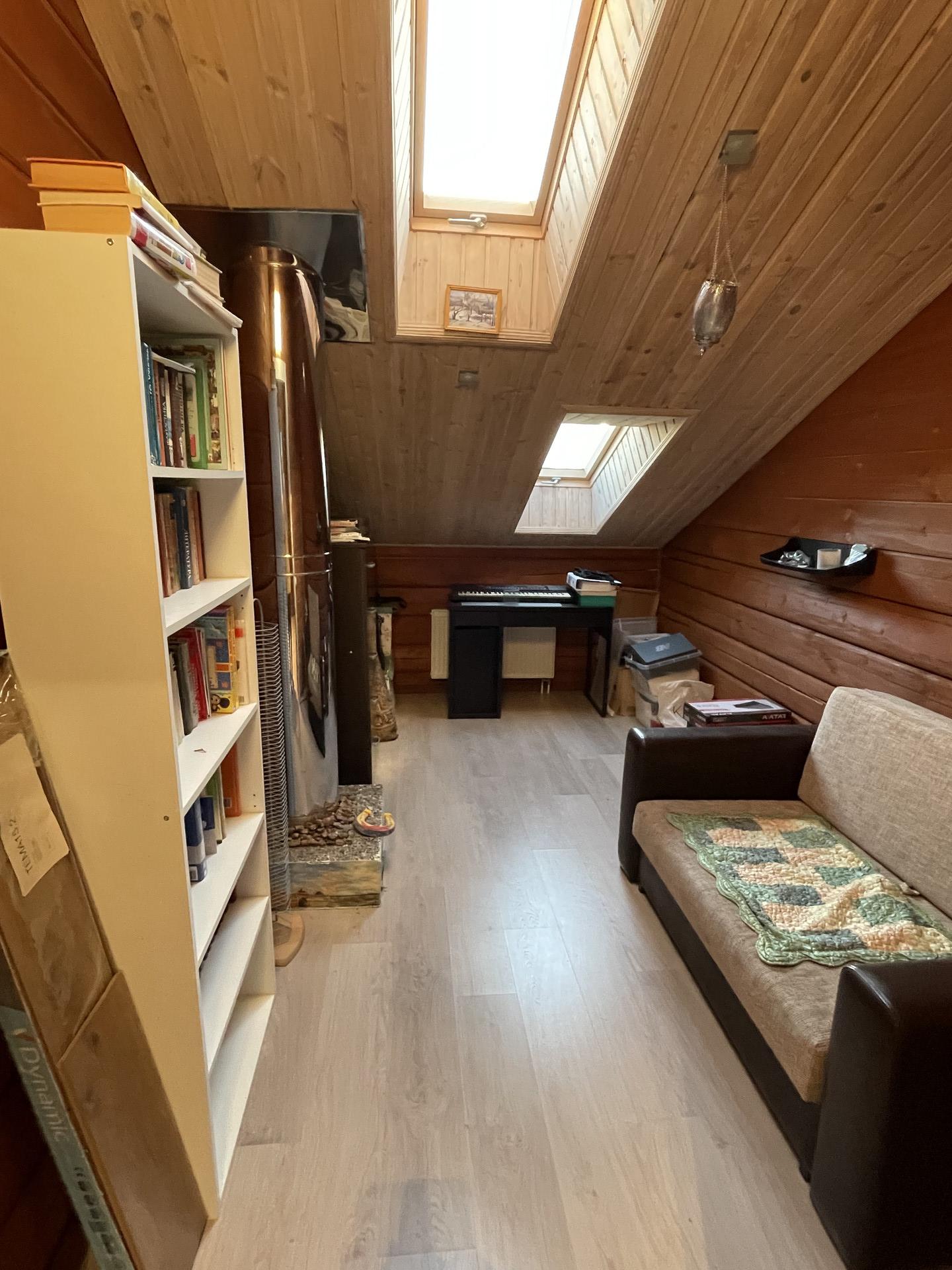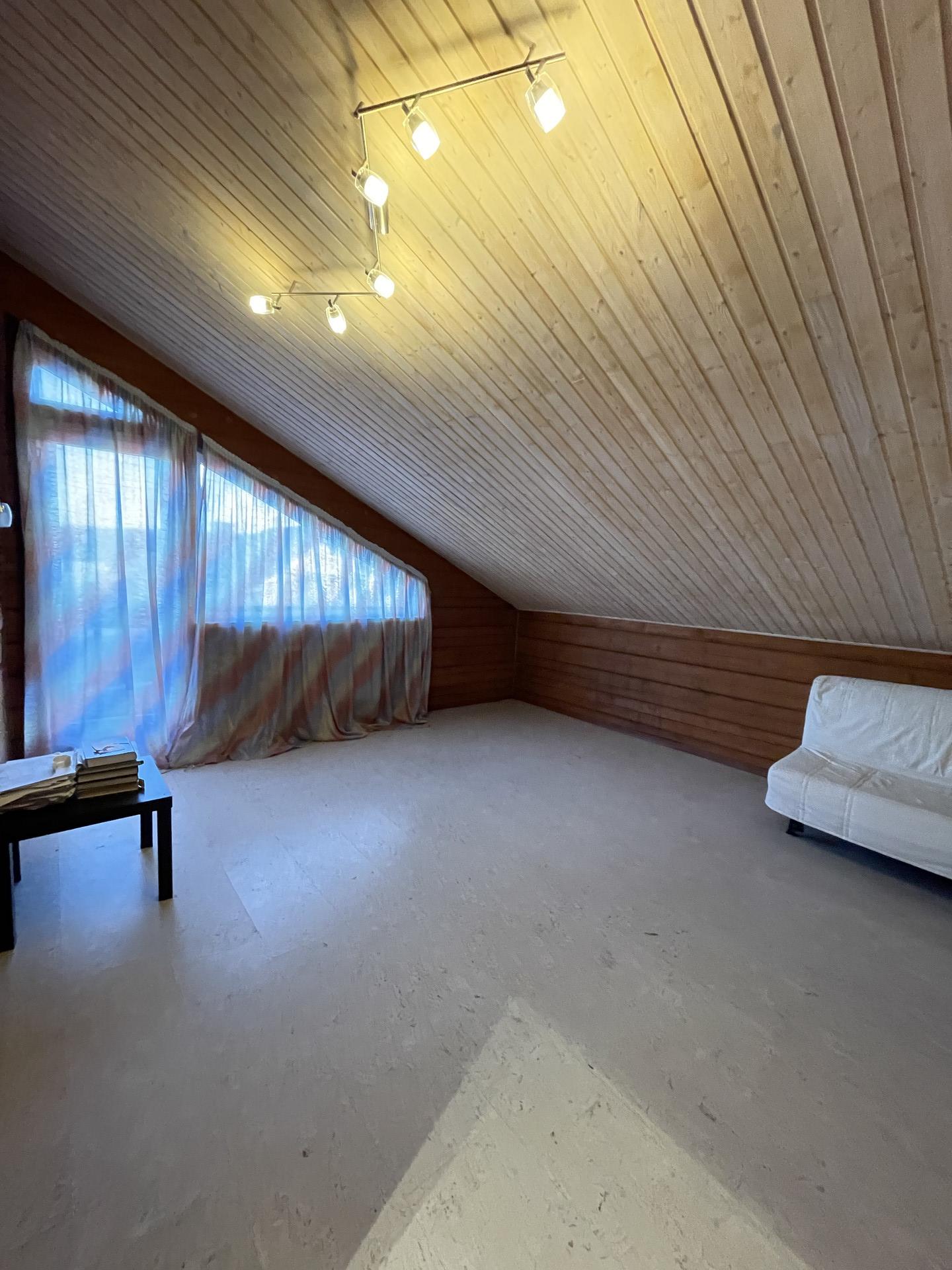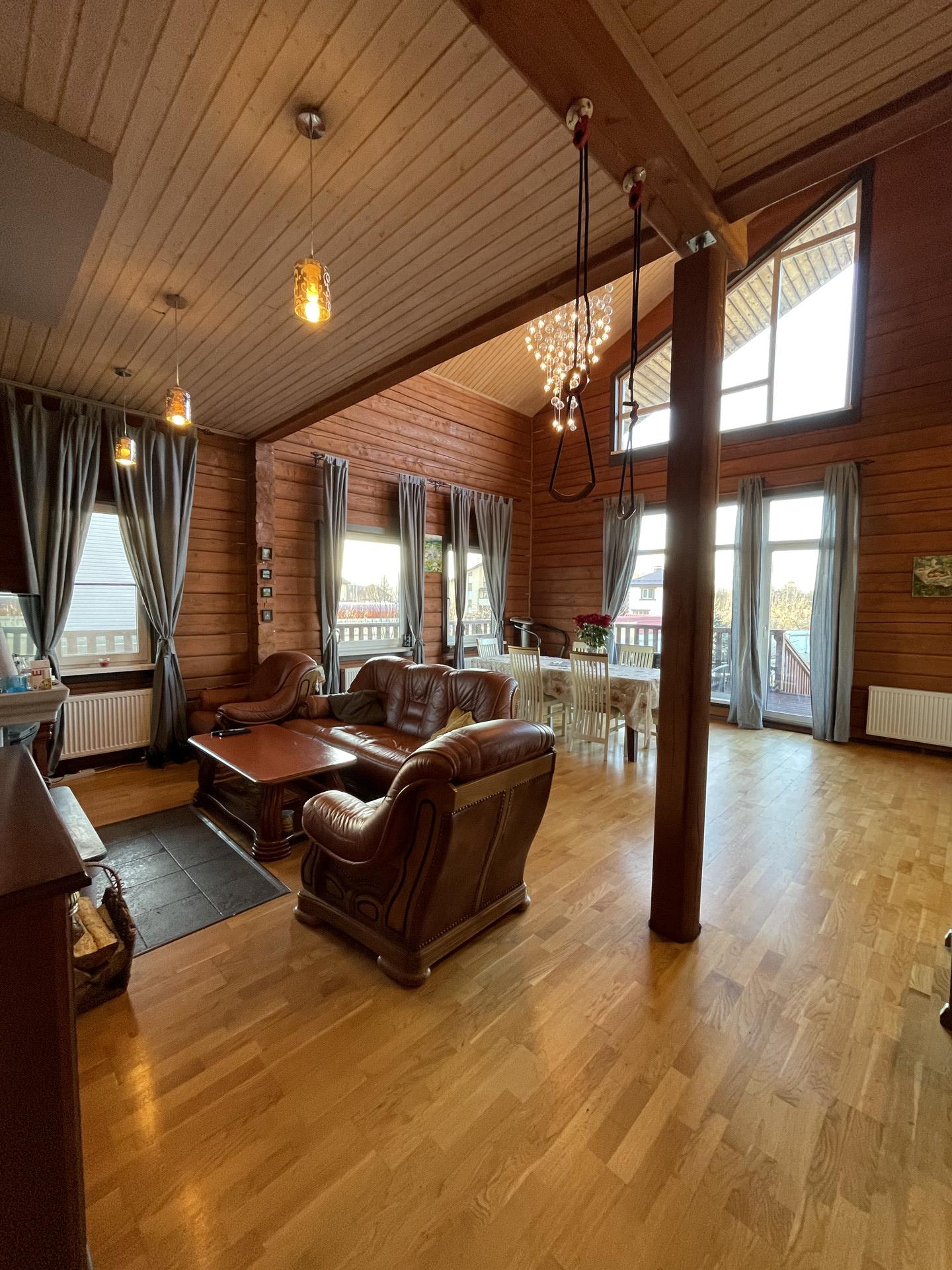 Первый этаж- кухня гостиная -70 кв.м (со вторым светом, высота от пола до потолка 8 м.), в гостиной установлен камин, спальня -20 кв.м, финская сауна, душ, туалет, хоз помещение.