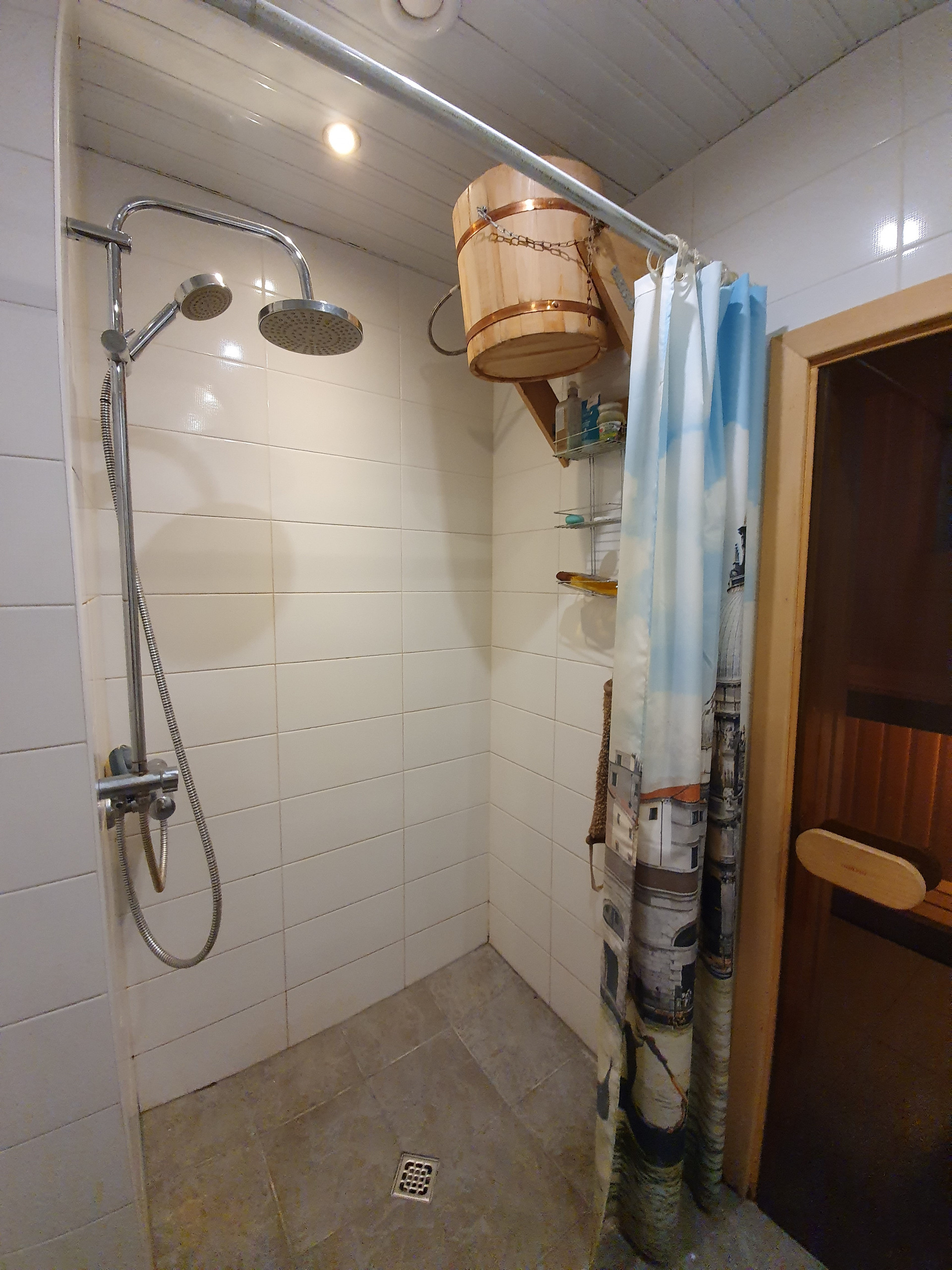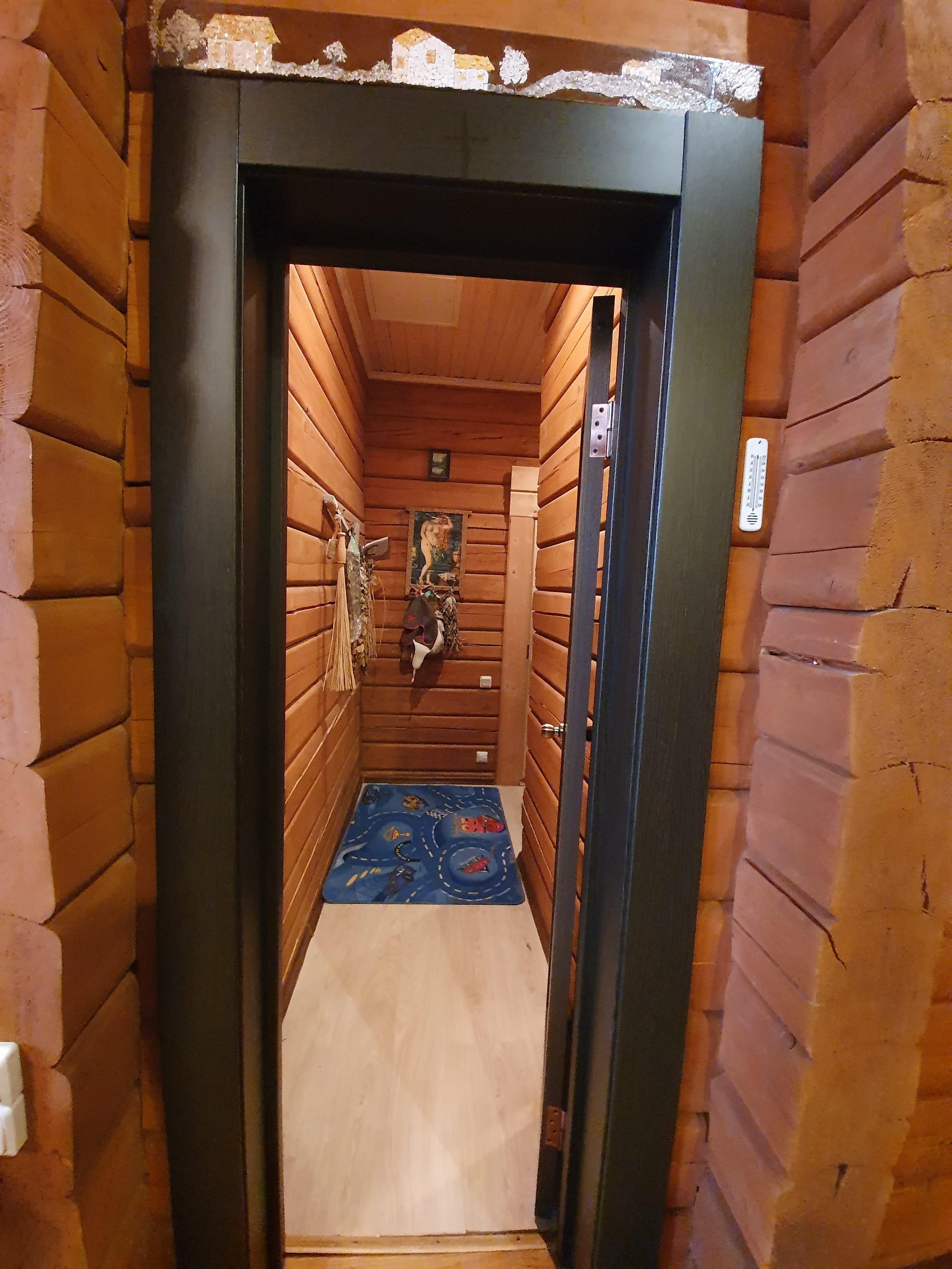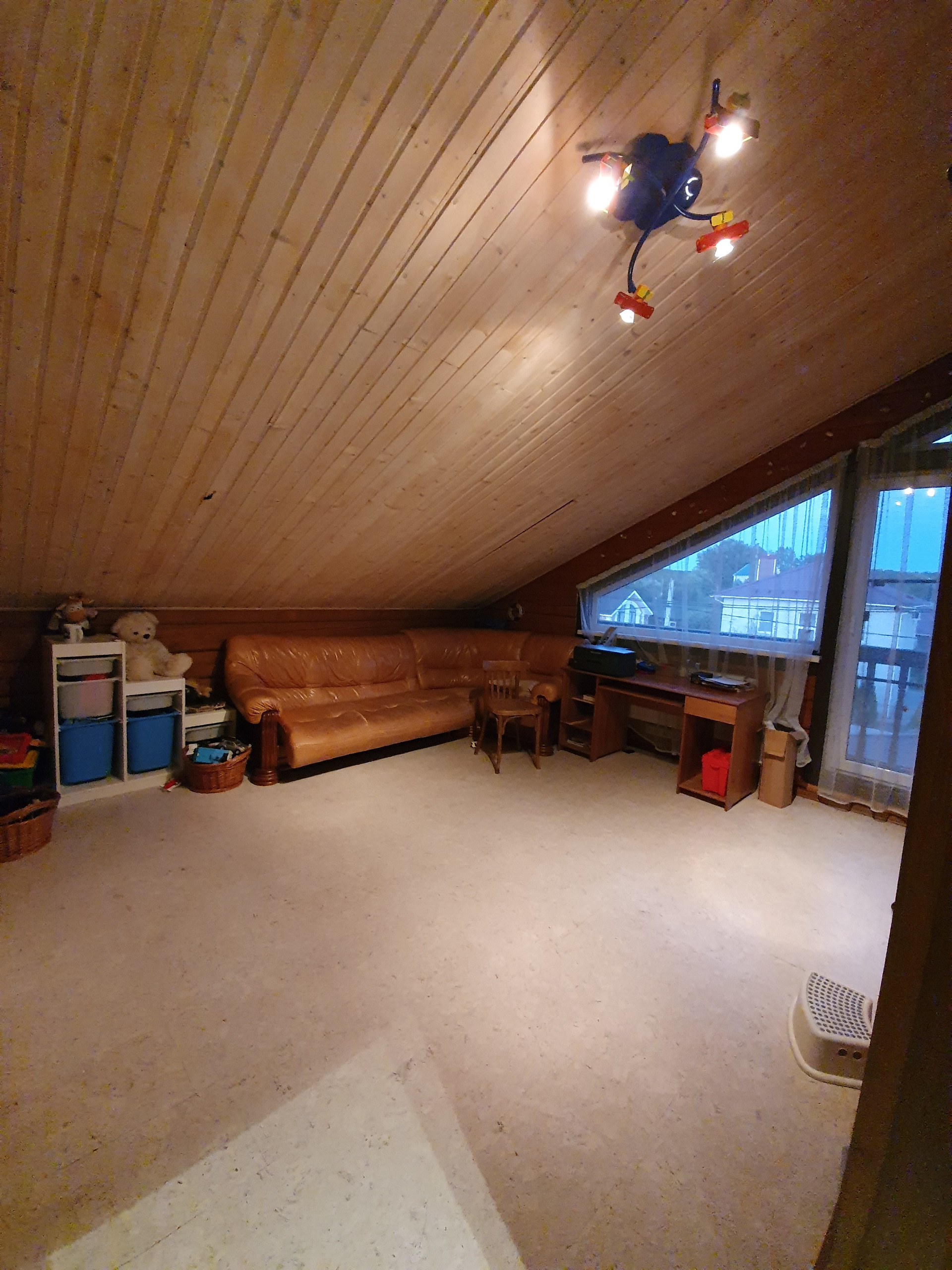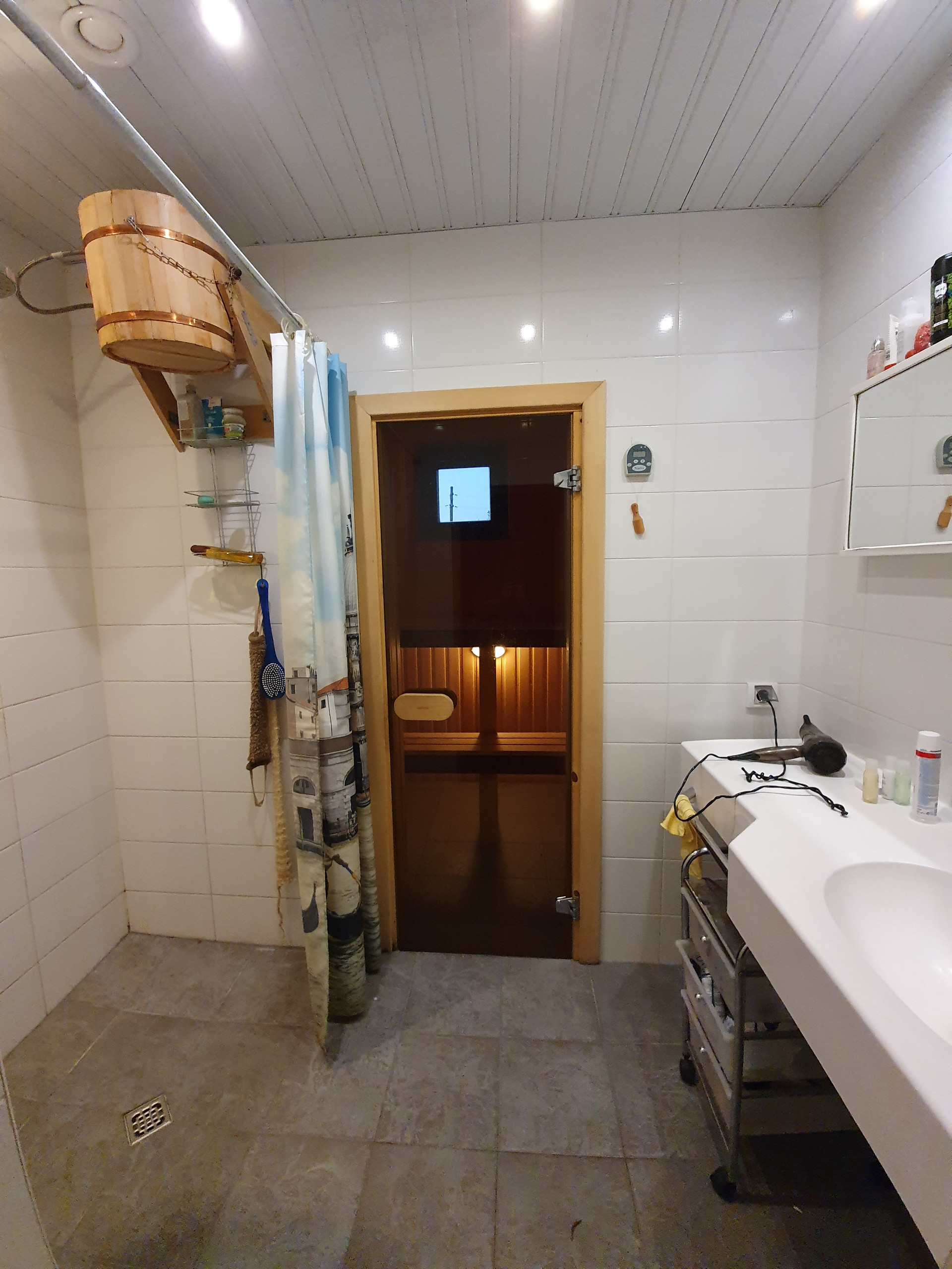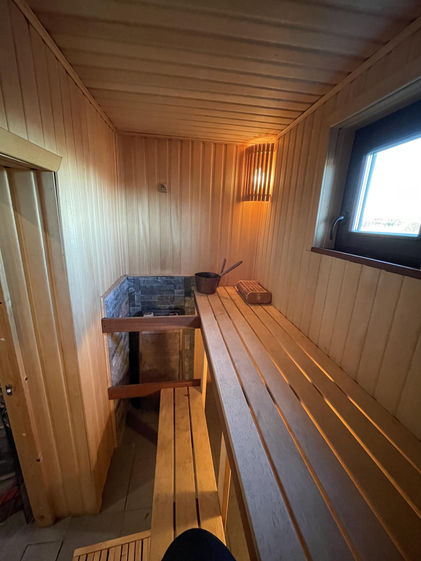 Первый этаж- кухня гостиная -70 кв.м (со вторым светом, высота от пола до потолка 8 м.), в гостиной установлен камин, спальня -20 кв.м, финская сауна, душ, туалет, хоз помещение.
