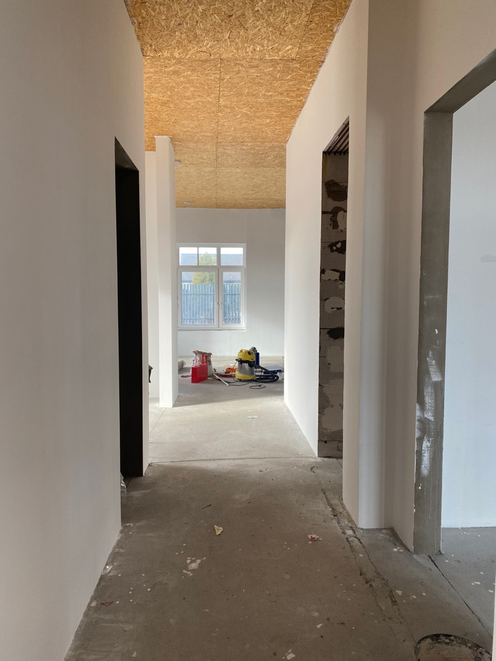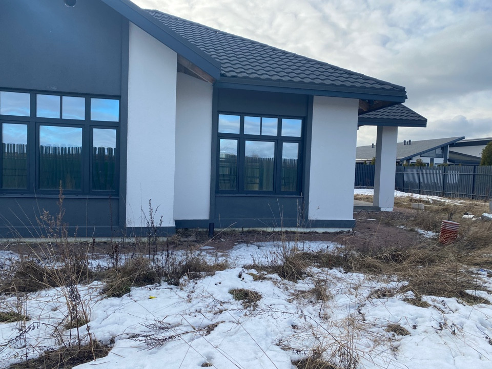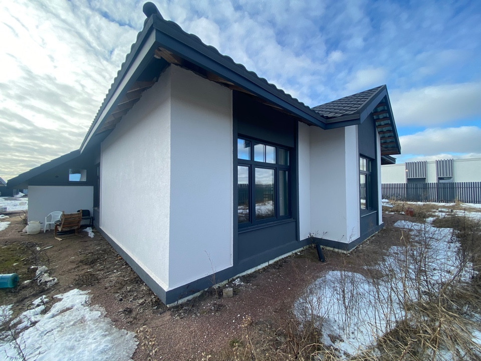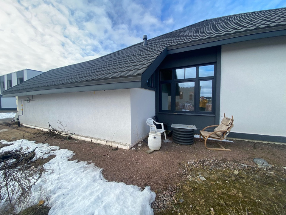 Продается современный дом, построенный по стандартам европейских стран с применением современных технологий. Стены из пеноблоков (300), утепление минеральной ватой (100 мм), декоративная штукатурка. Остекление панорамное. Полусухая стяжка. Теплые полы по всему дому. Высота потолков 3,4 м. Крыша - композитная металлочерепица. Предчистовая отделка (на фото). Ограждение территории из металлического штакетника, ворота откатные. Гараж с автоматическими воротами. Газ (котельная Viessmann ), центральное водоснабжение, электроэнергия 15 кВт, станция биологической очистки Kolo Vesi.