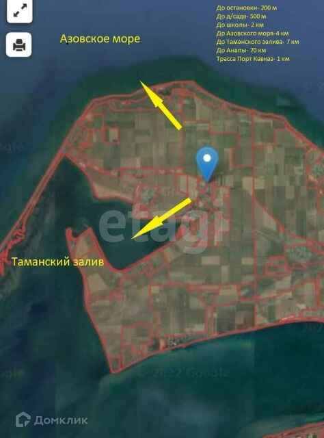 До пляжа Азовского моря 4 км., до Таманского залива 7 км., до Анапы 70 км., рядом проходит федеральная трасса Порт Кавказ.