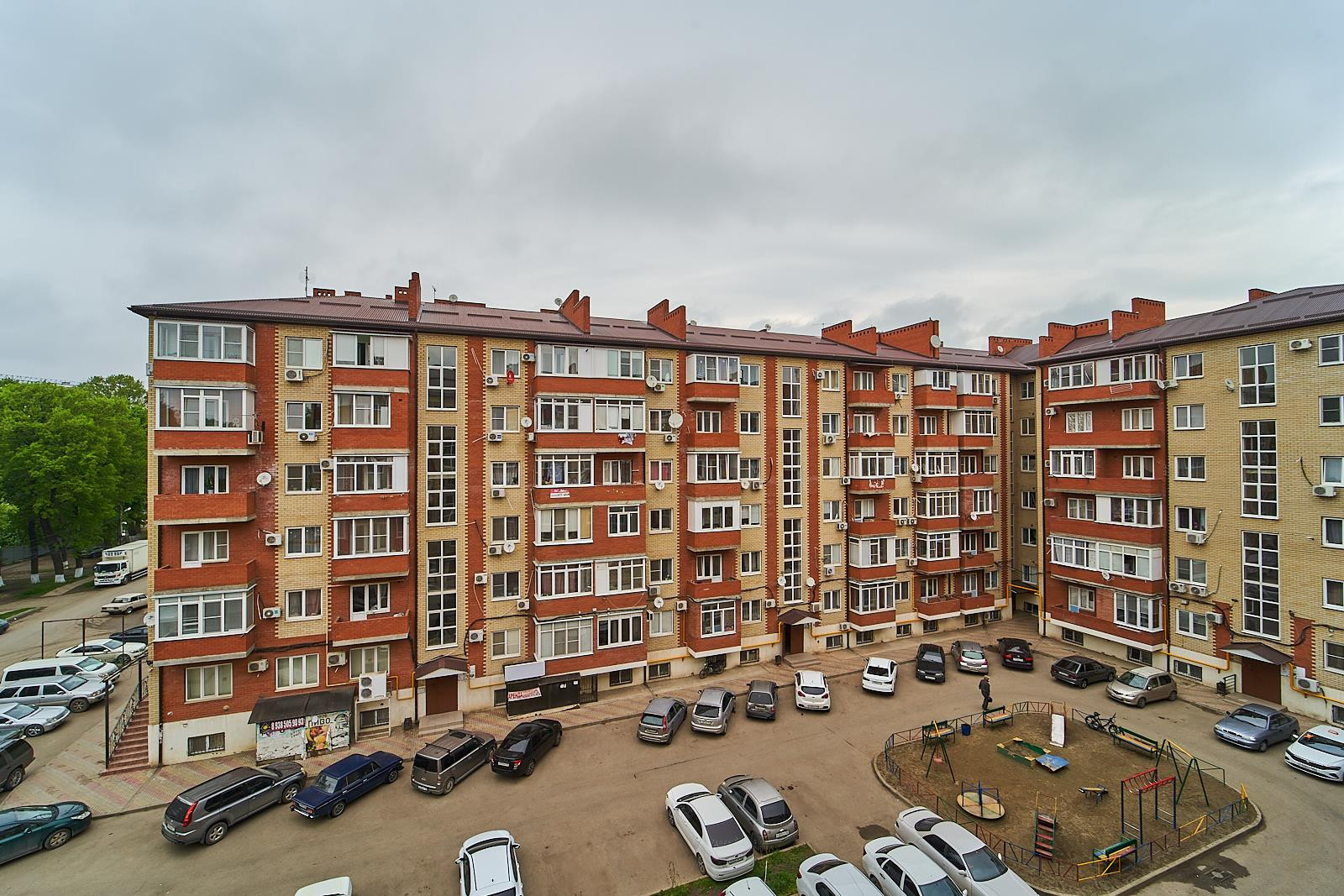 Во дворе детская площадка, наземная парковка. Рядом остановка общественного транспорта.
