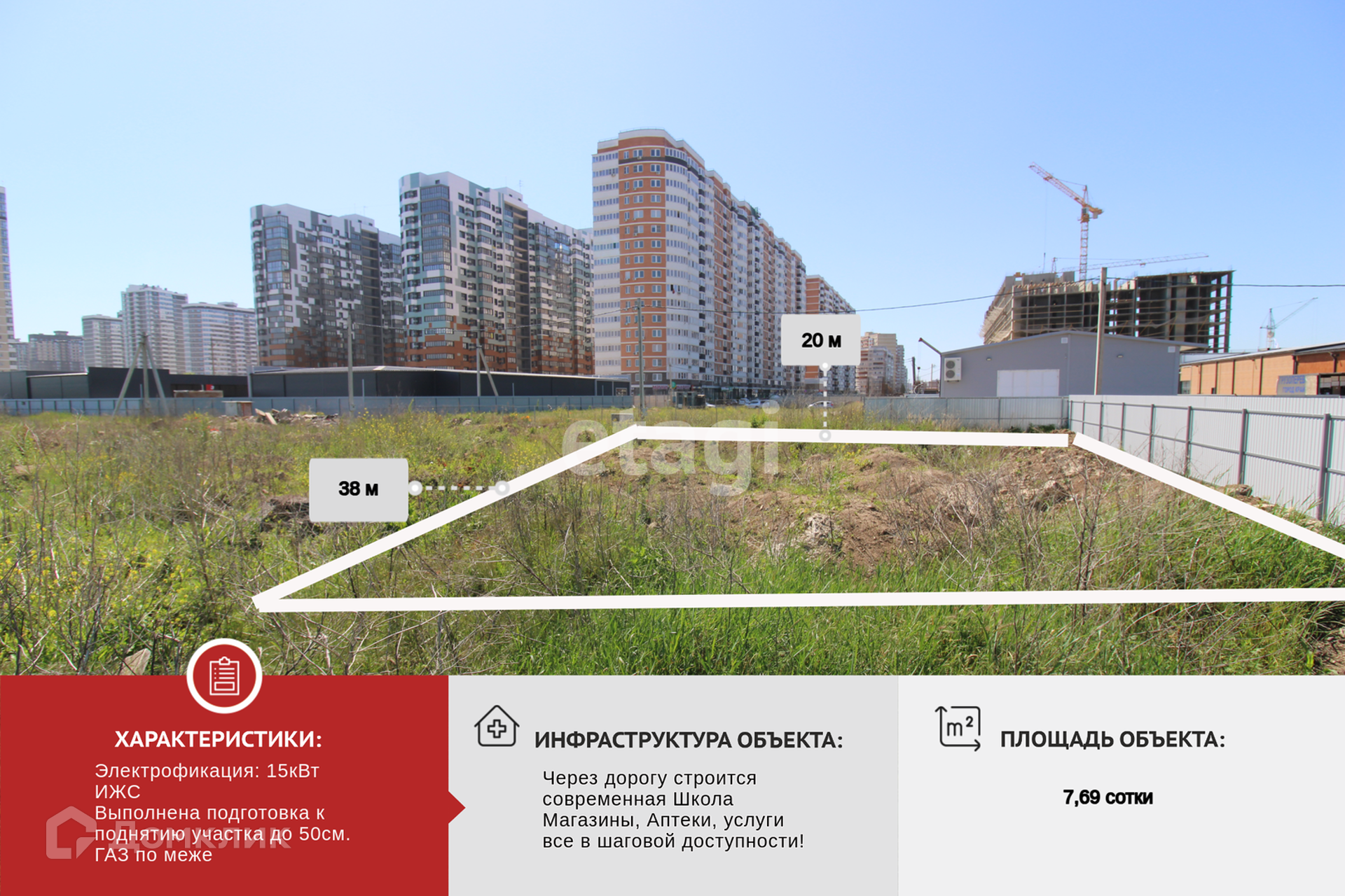 Продается З/У, п. Краснодарский, ИЖС, электрофикация - 15кВТ 3 фазы, на участке установлен столб и счетчик учета, можно пользоваться. По меже ГАЗ, вода и канализация. Заезд возможен через широкую сторону с стороны ул Командорской. Через ул Дорожная в 5 минутах ходьбы размещаются магазины, Аптеки, пекарни, Екатериненская клиника, кафе и т.д., строится современная школа на 1550 мест, остановка общественного транспорта. На участок завезена земля с целью поднятия всего участка до 50см, никакие дожди и таяние снега не подтопят участок. Подходит для строительства частного дома так для коммерческого назначения.