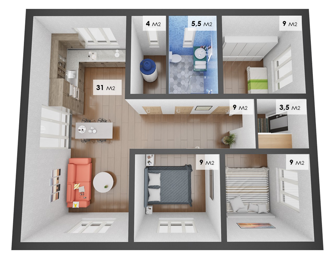 Три спальни, кухня-гостиная, санузел, тех. помещение (гардеробная).
