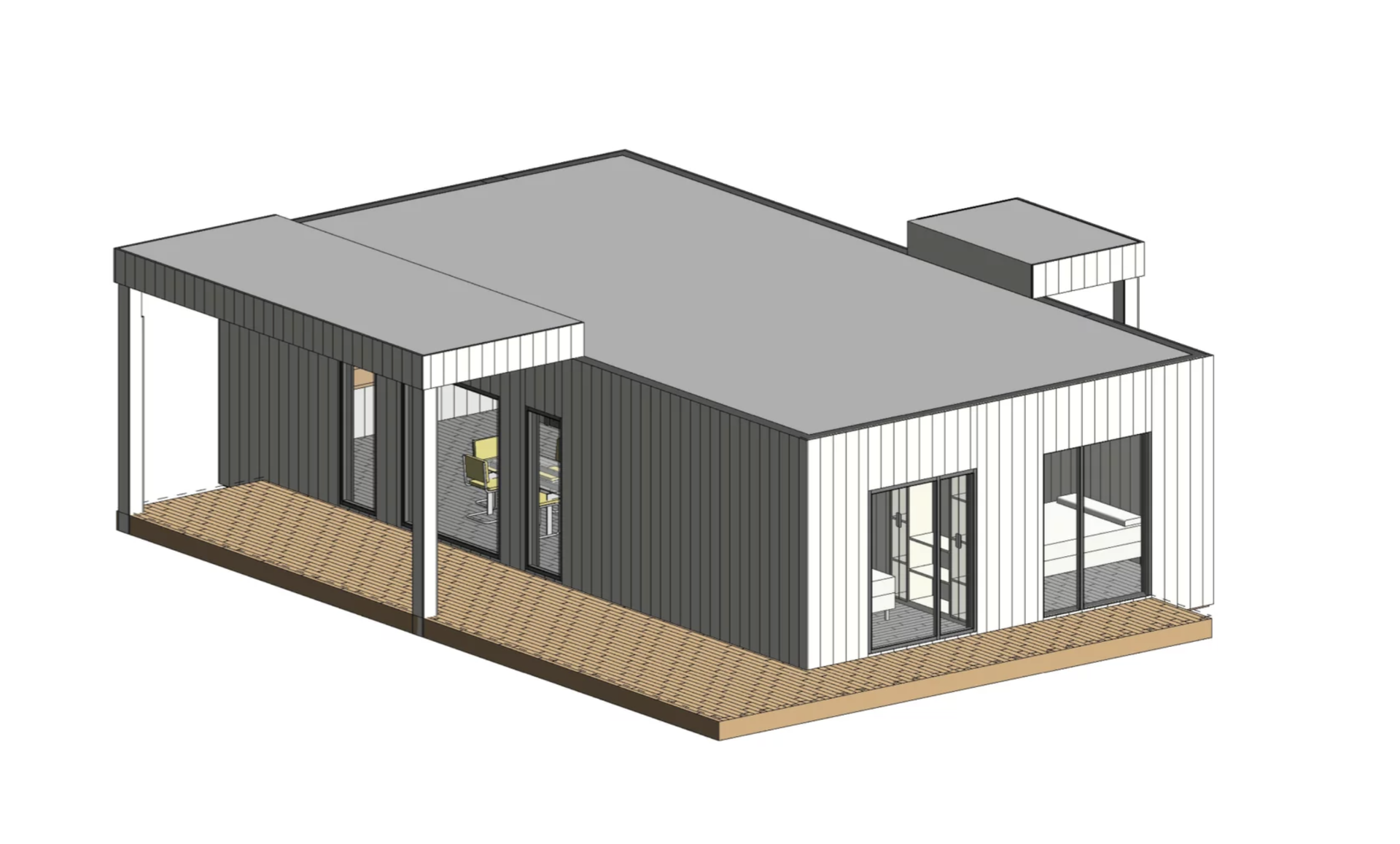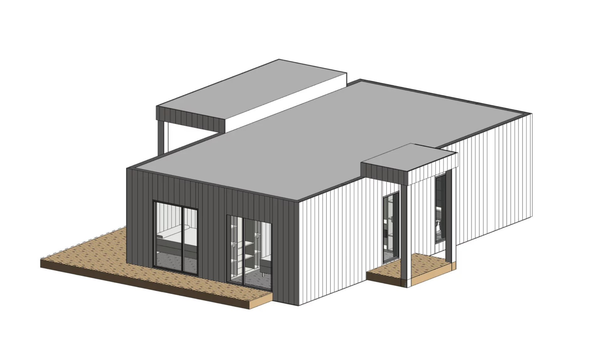 Металлический сайдинг с фактурой под дерево — комбинация цветов на выбор клиента. Опция: отделка планкеном хвойных пород или сайдингом, покрытым пленкой с имитацией структуры дерева (выглядит как дерево, проще в уходе)