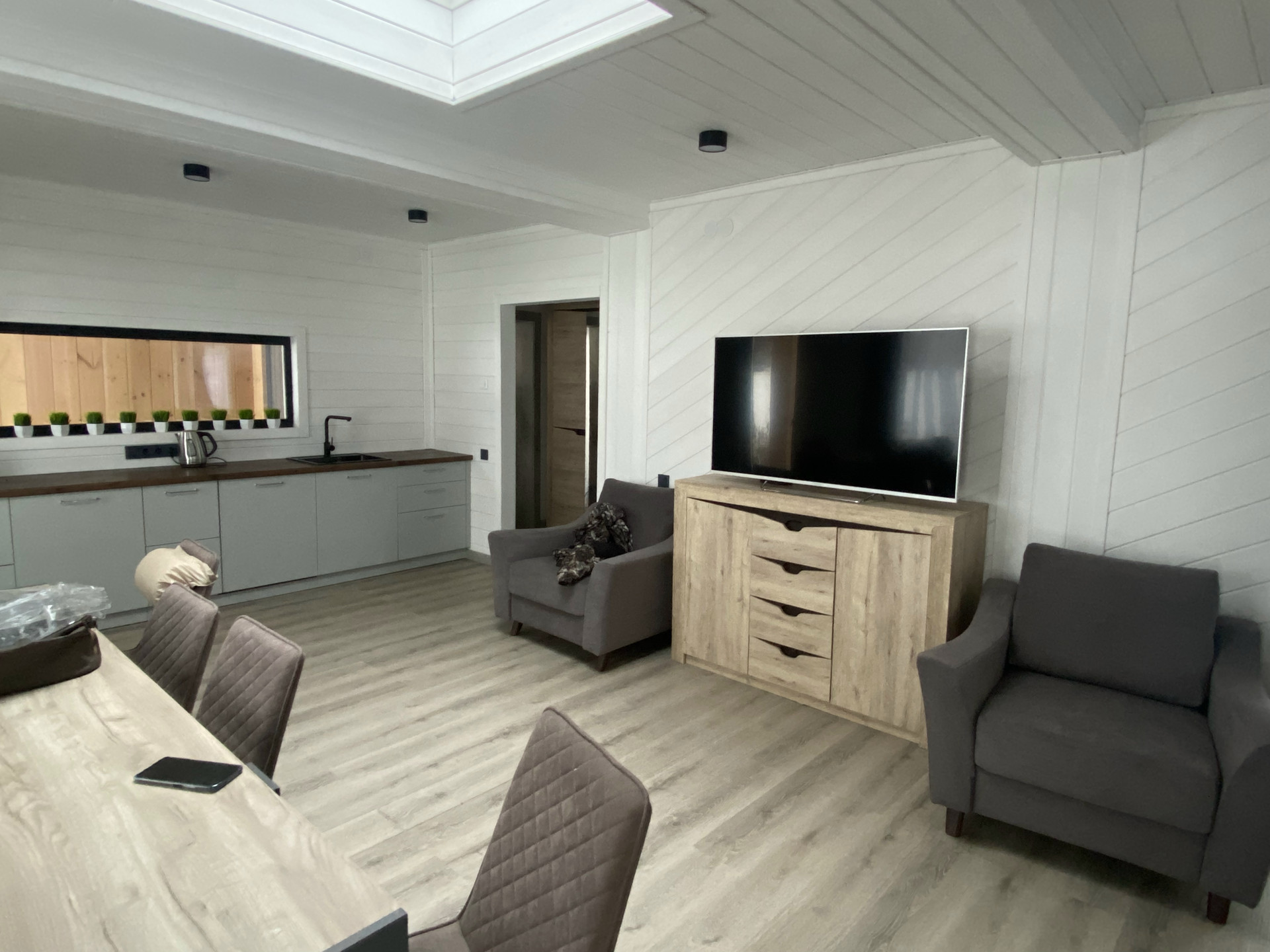 Стены: окрашенная имитация бруса и окрашенная интерьерная доска толщиной 20 мм в комнатах и тамбуре (в цвет по выбору), керамическая плитка в с/у. Полы: SPC ламинат в комнатах, керамогранит в с/у и тамбуре (теплый пол под ламинат опция)