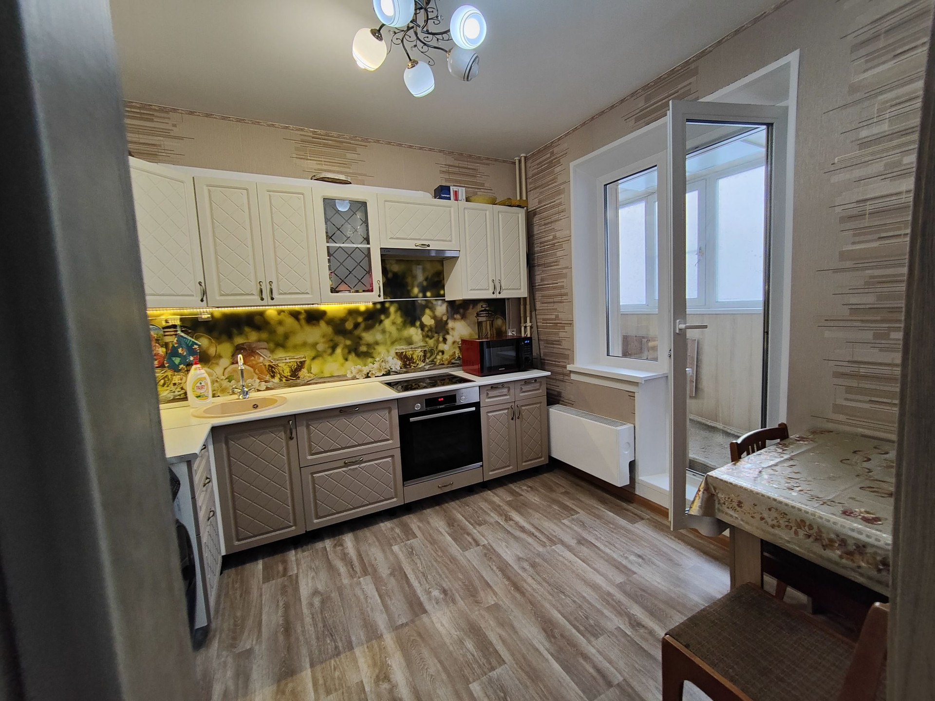 На кухне остается кухонный гарнитур со встроенной техникой.