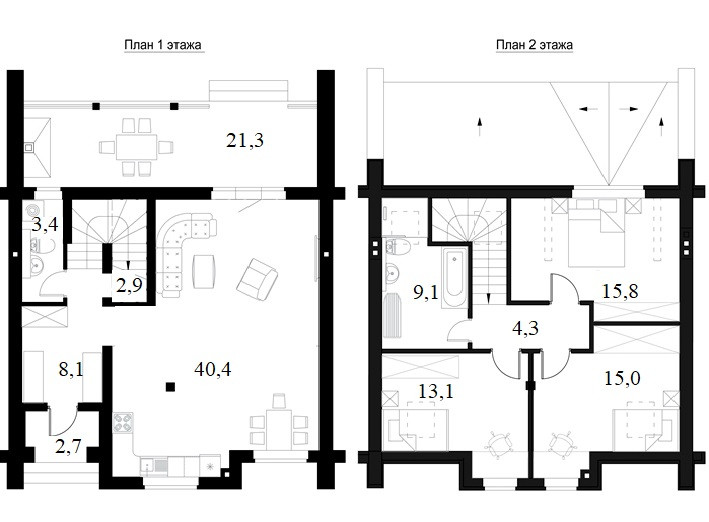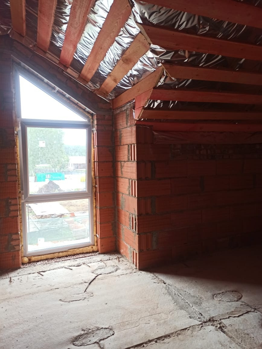На втором этаже – приватная зона: из холла - три спальни (13,15 и 16м2) и большой хозяйский санузел с ванной 9м2. Высота потолков в верхней точке 2,8 м, в нижней – 1,6 м. В дополнение к фронтальным окнам – мансардные, расположенные непосредственно в крыше.