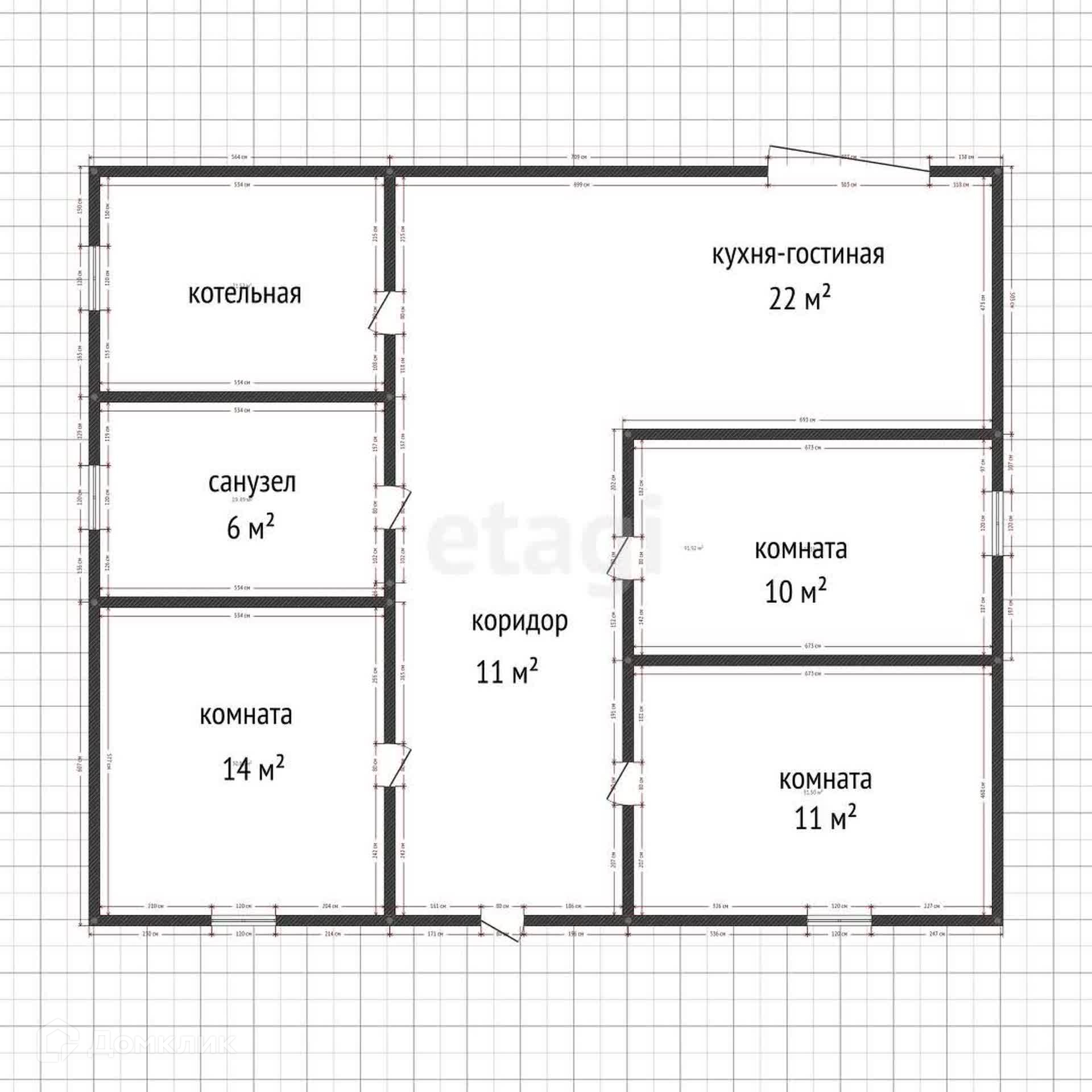 Три спальни, два санузла,котельная, кухня-гостиная с выходом на террасу.