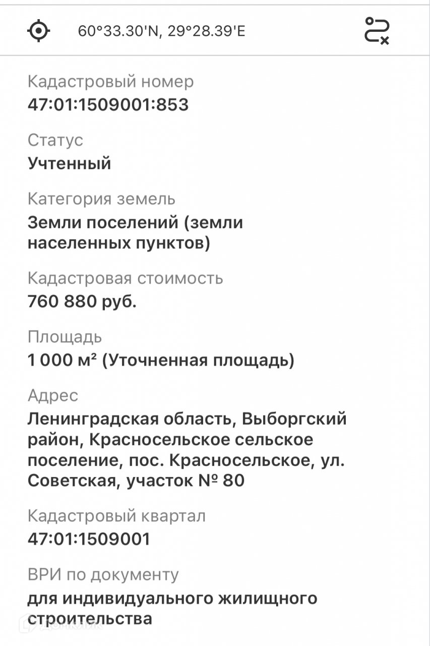 №332870 192 Предлагается в продажу земельный участок Лен.обл.Выборгский р-он п.Красносельское ул.Советская уч.№80. 10 соток ИЖС ( аренда 49 лет с правом выкупа 3% от кадастровой стоимости после того как дом будет оформлен в собственность). На участке сделан фундамент 8*8 ( свайно-винтовой глубина 2 м). Электричество 15 КВт подключено. До участка осталось подвести 30-50 метров от точки подключения центральный водопровод. Участок расположен на второй линии от дороги. В 150 метрах есть родник с чистейшей питьевой водой. Отличное место расположение. Хорошая транспортная доступность: автобус до г.Выборга и пгт.Рощино, маршрутка до ж/д станции Кирилловское. До трассы Скандинавия 14 км. В посёлке есть вся инфраструктура: Хрaм Тиxвинскoй иконы Божиeй Mатepи, школа, детский сад, отделение почты, аптека, сетевые магазины и т.д. Координаты 60°33.30`N, 29°28.39`E