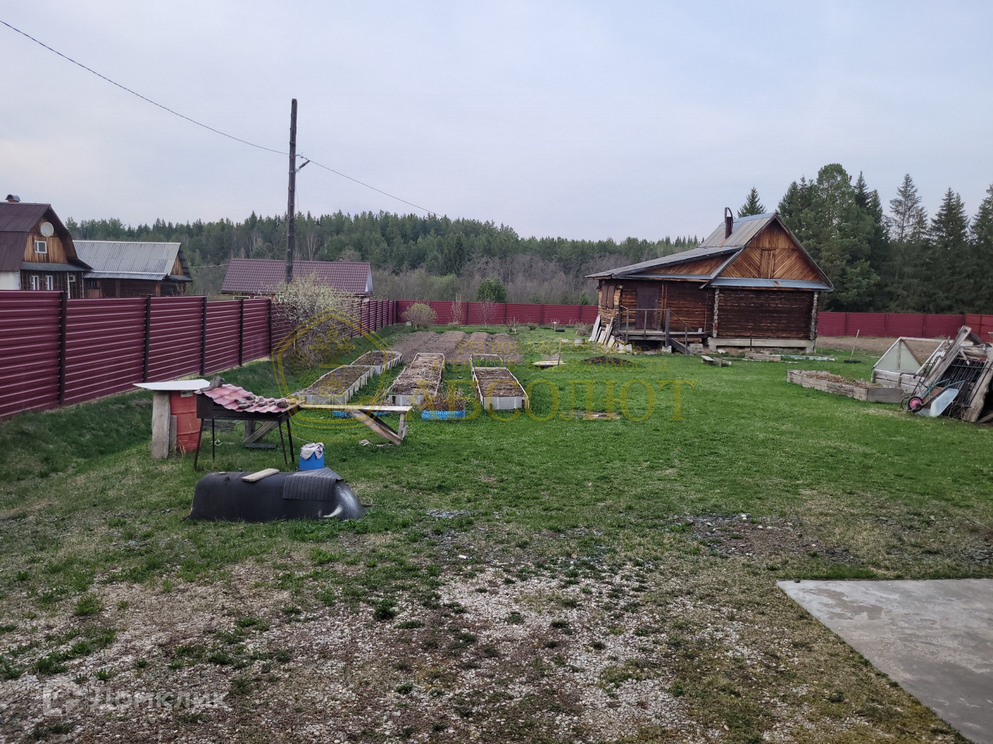 Земельный участок площадью 34 сотки, участок разработан есть теплицы, парники и грядки. Отдельно на участке стоит рубленный сруб для бани на фундаменте под крышей без внутренней отделки. Вода в дом подаётся из скважины, слив канализации производится в автономный септик.