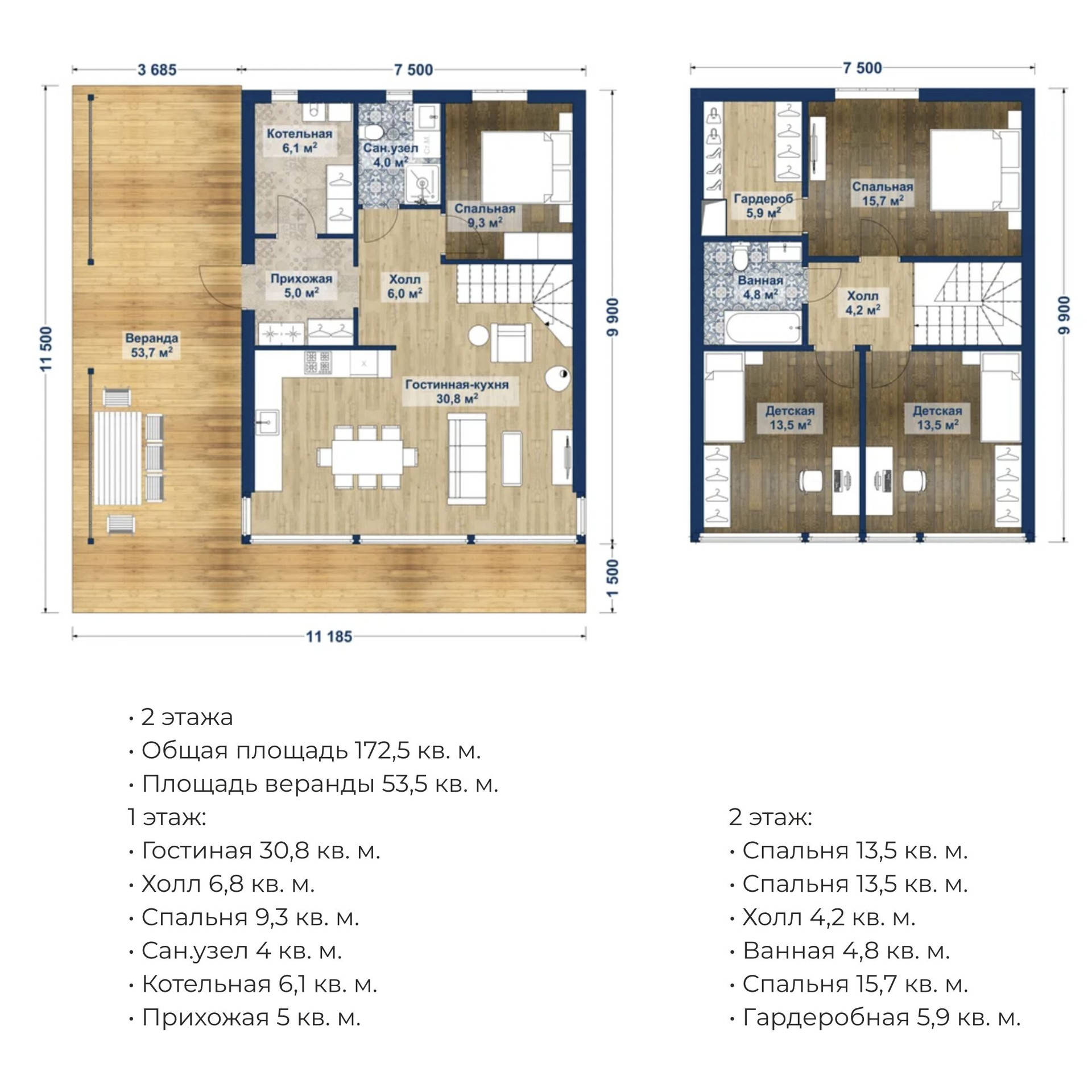 Площадь дома позволяет сделать различные планировочные решения, Вы можете выбрать готовый вариант или можем разработать его специально под Ваши предпочтения, например, сделать игровую комнату для детей, спланировать рабочую зону или кабинет с прекрасным видом.