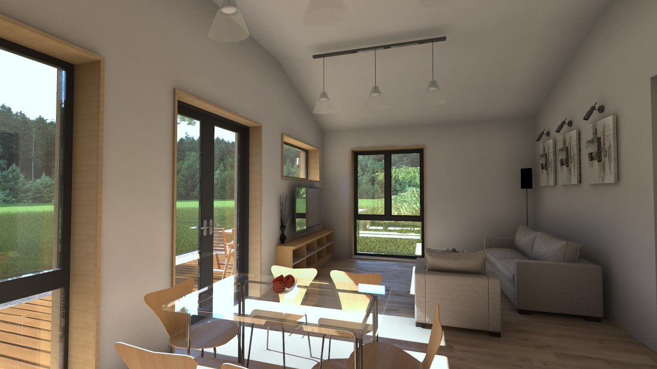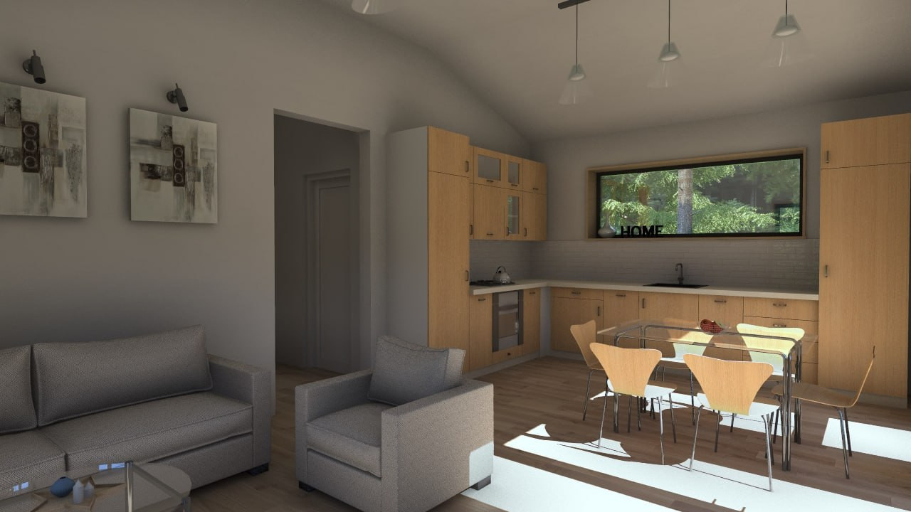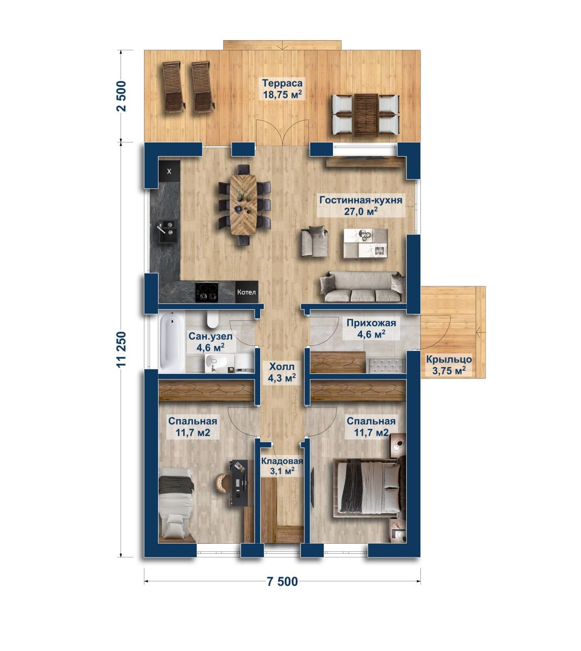 Две спальни по 11,7м2; санузел 4,6м2; холл 9,5м2; котельная 4,3м2; прихожая 4,6м2; и просторная кухня-гостиная 27м2, крыльцо 3,75м2 и просторная терраса 18,75м2