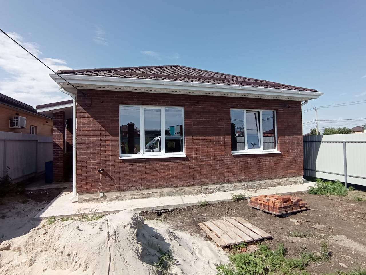 3 комнаты, санузел, кухня-гостиная с выходом на террасу. Дом сдается под чистовую отделку: стяжка, штукатурка, электроразводка, теплый пол, радиаторы отопления, двухконтурный газовый котел. В стоимость входят отмостка, забор, ворота, калитка, свет 3 фазы.