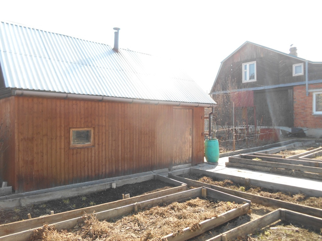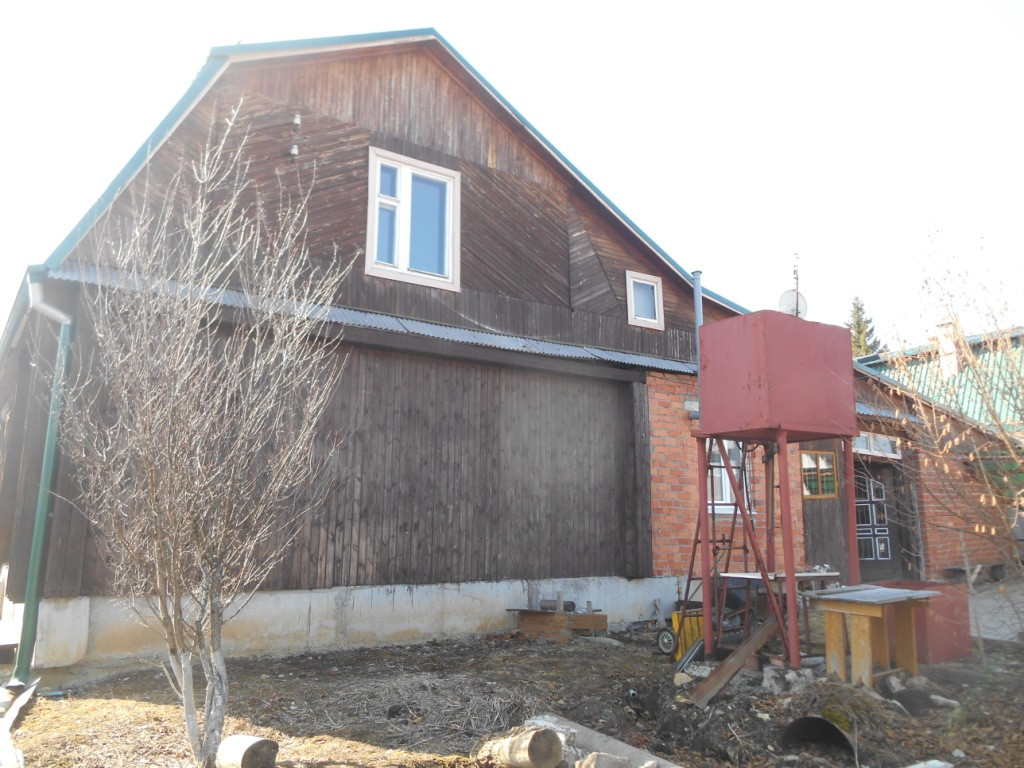 Фундамент - бетонный ленточный, стены дома из бревна 22 см, гараж -кирпичный 46,1 кв. м.