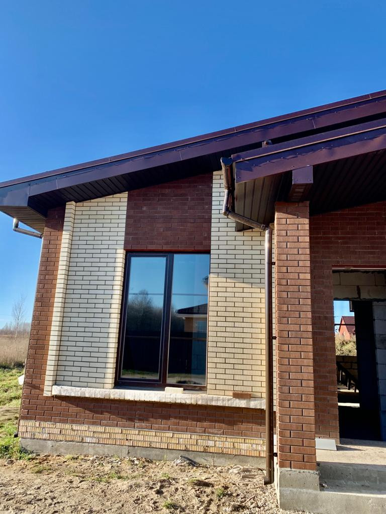 Кровля утепленная из металлочерепицы коричневого цвета, выполнена система водоотведения кровли, подшивка софитов перфорированным пластиком, смонтированы снегозадержатели.