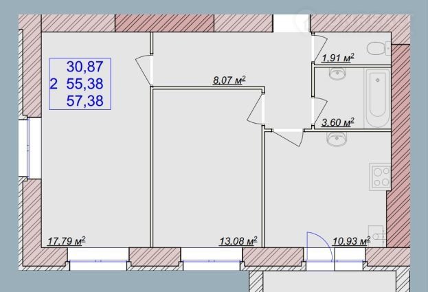 Общая площадь 57.4 м2