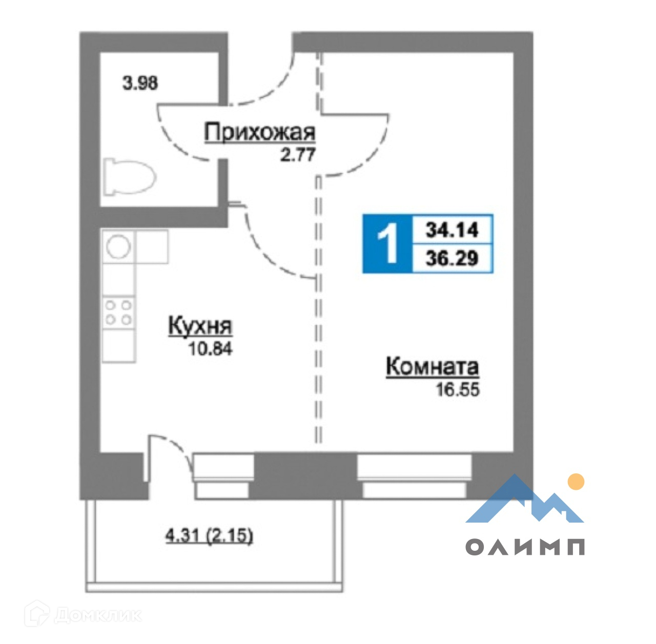 Общая площадь квартиры: 36,29 кв м. Комната: 16,55 кв м, кухня: 10,84 кв м.