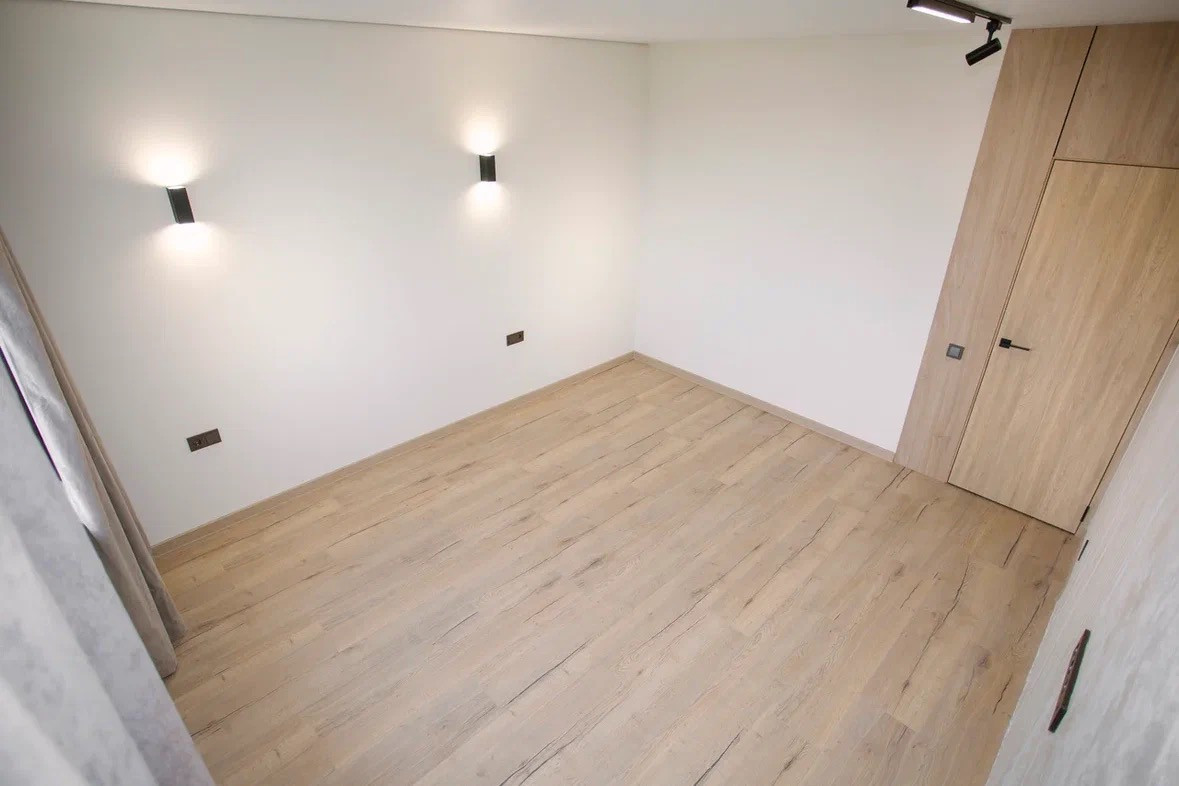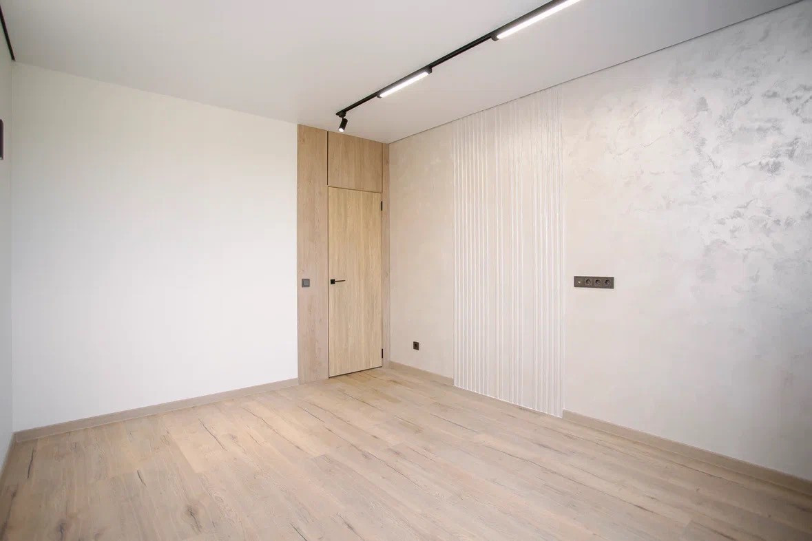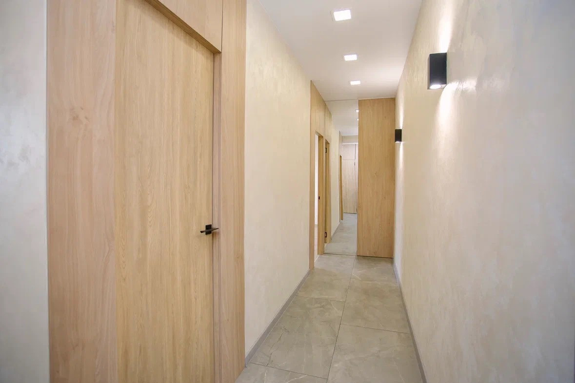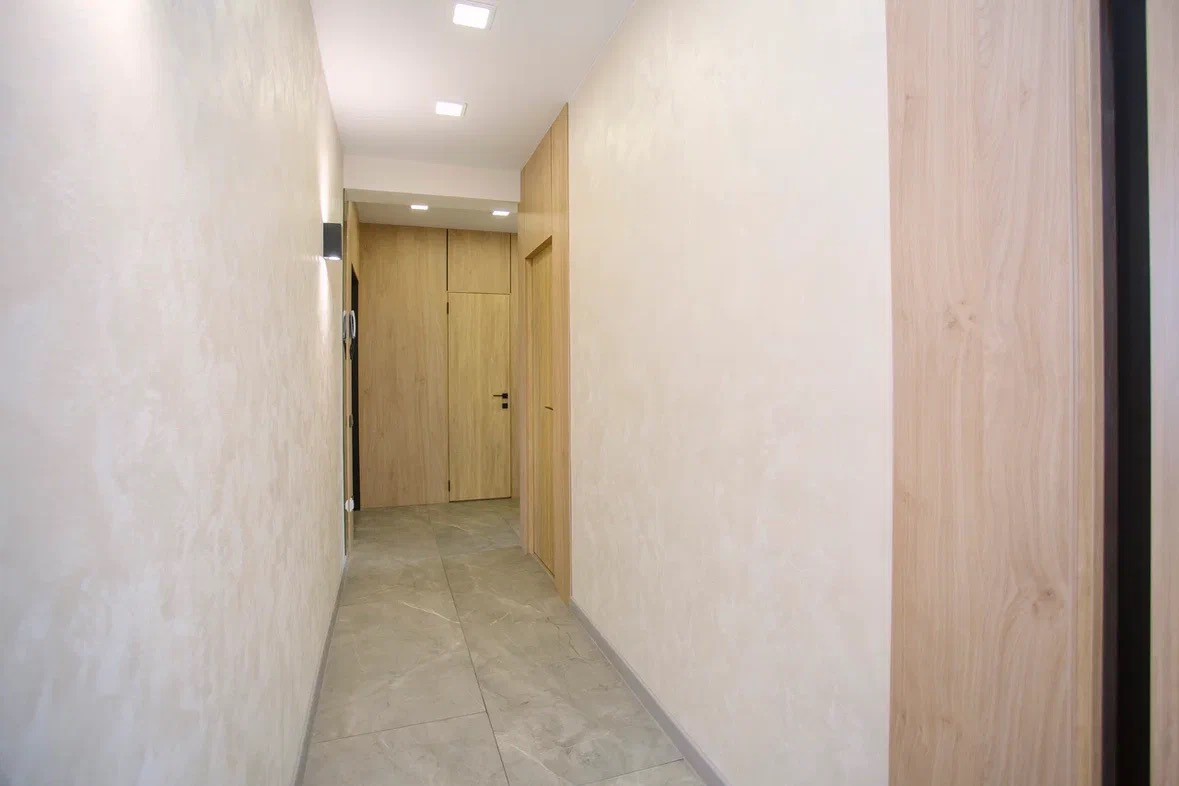 Отделка: полы плитка и ламинат, теплый пол, стены декоративная штукатурка, натяжной потолок с точечной подсветкой и теневым профилем, декоративные стеновые панели на обрамлении межкомнатных дверей.