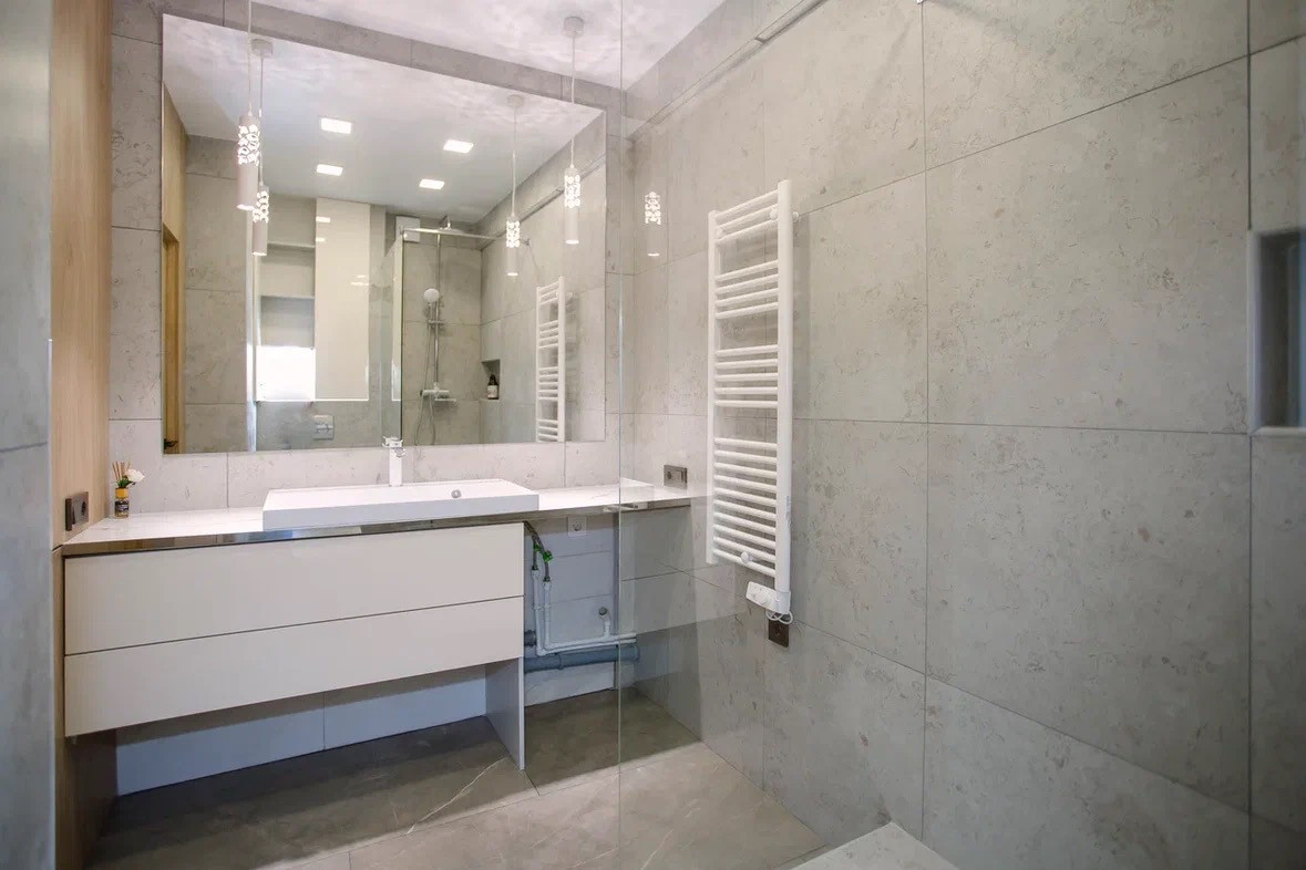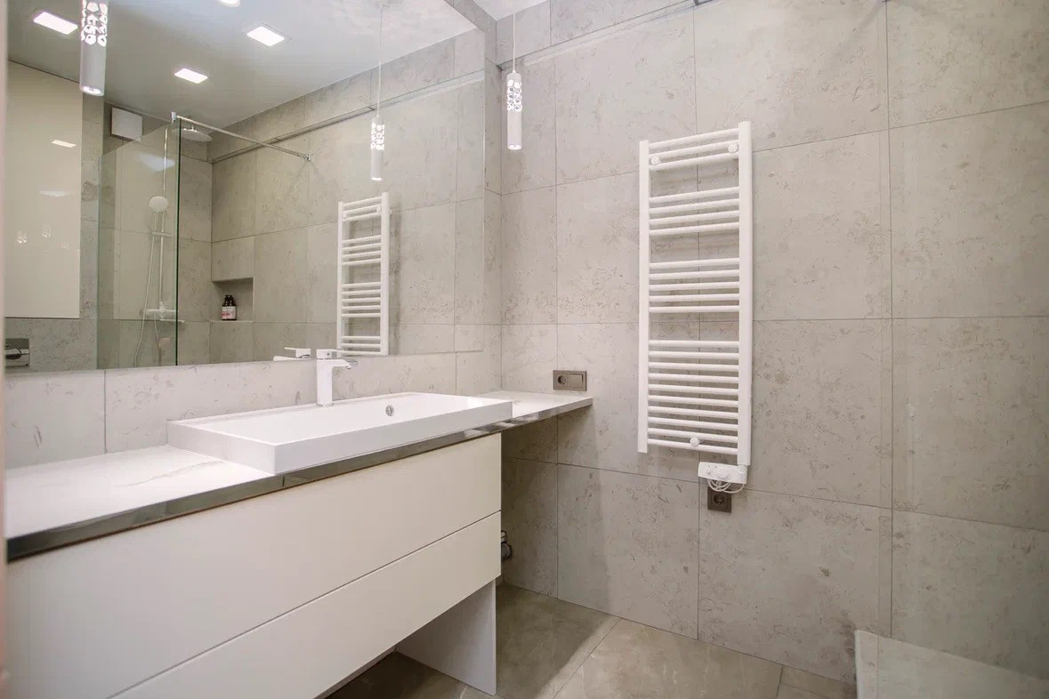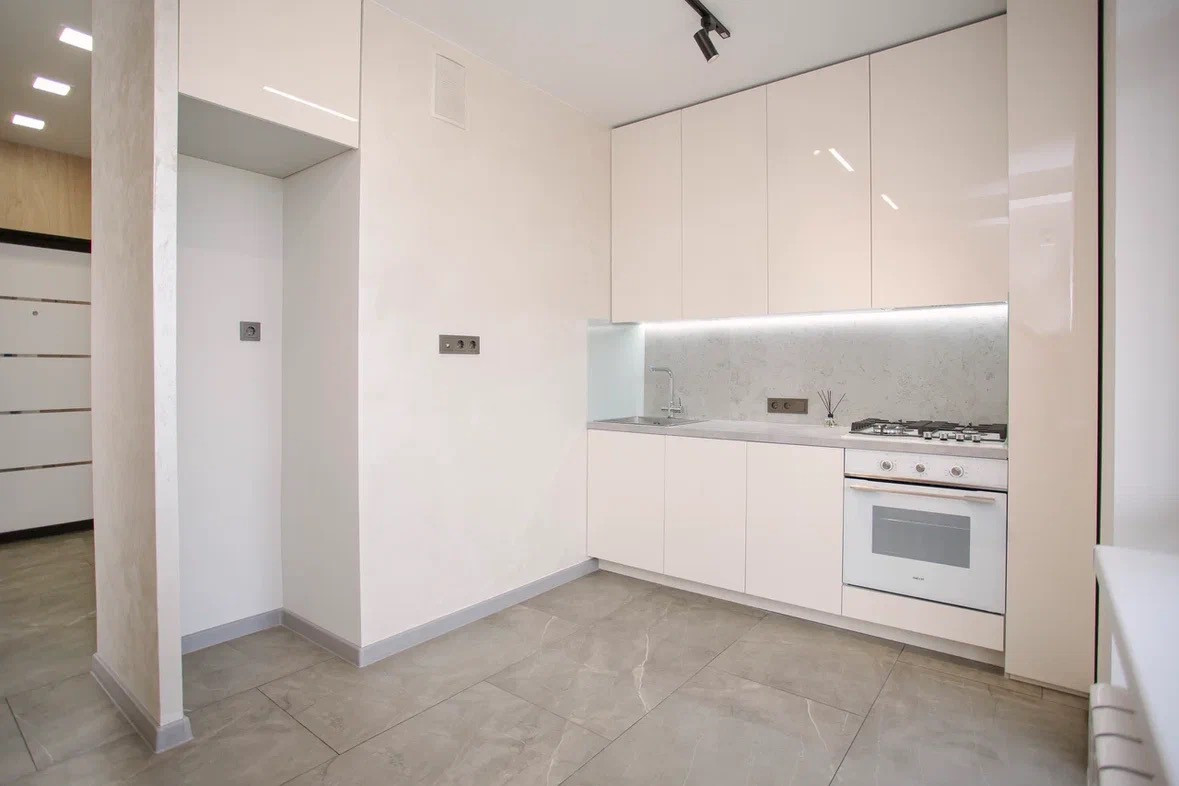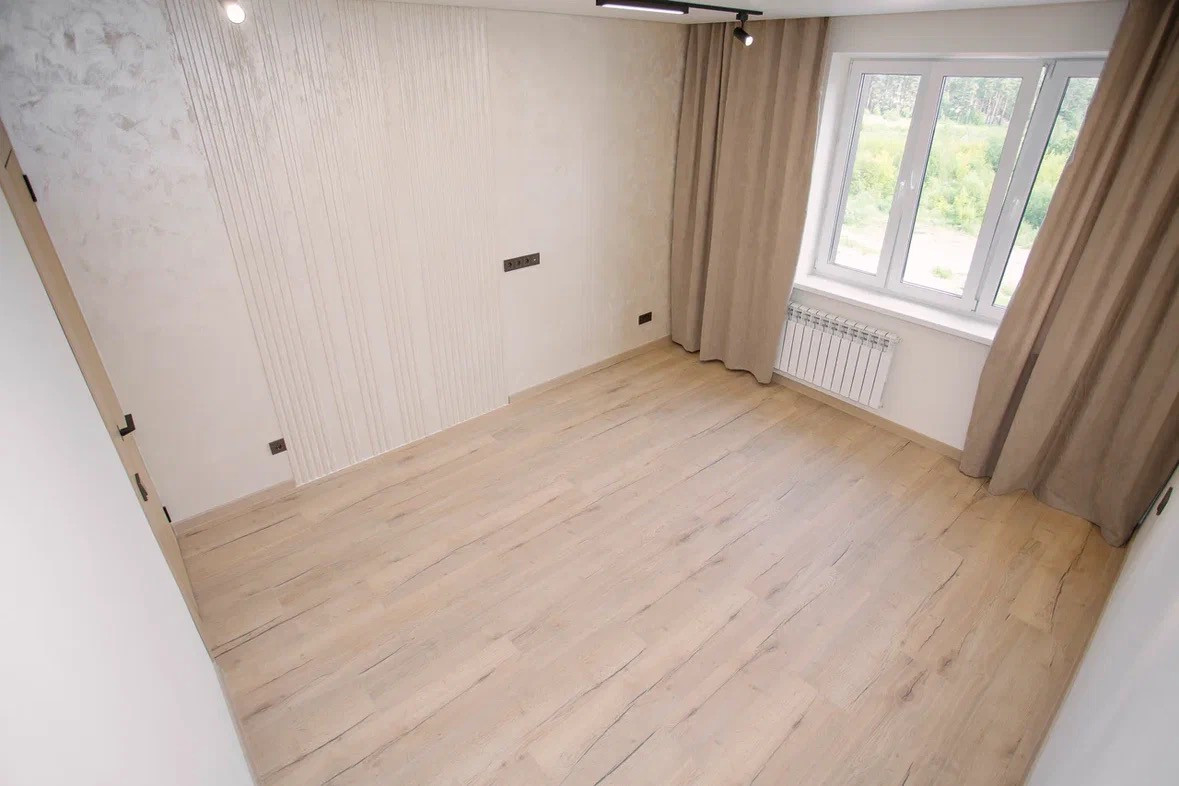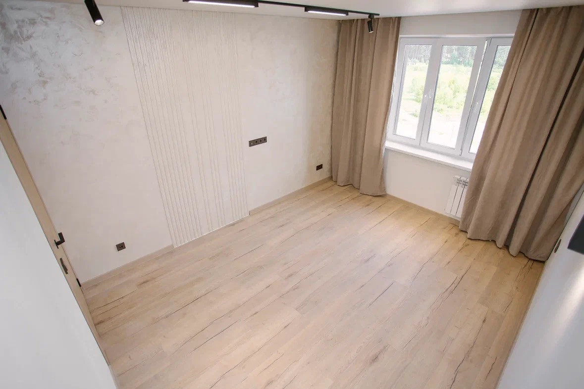 Отделка: полы плитка и ламинат, теплый пол, стены декоративная штукатурка, натяжной потолок с точечной подсветкой и теневым профилем, декоративные стеновые панели на обрамлении межкомнатных дверей.