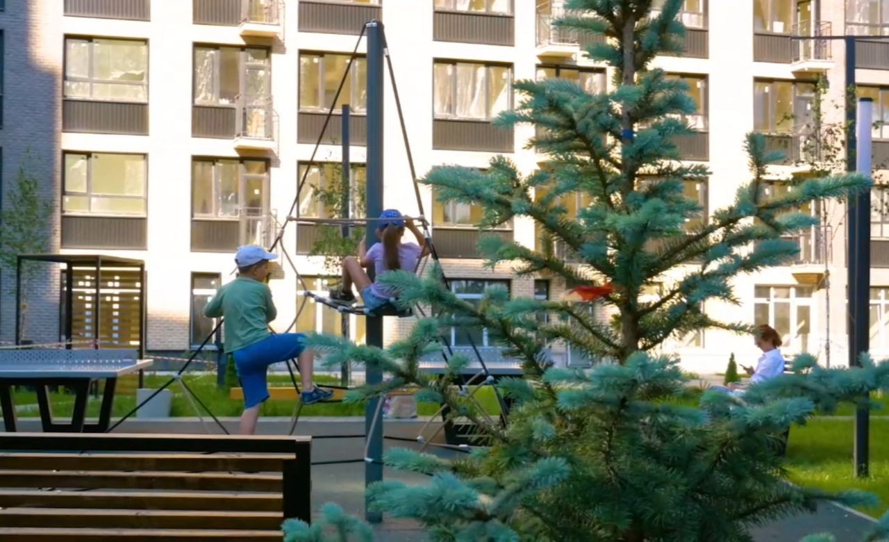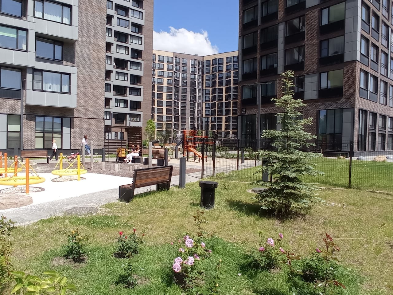 Парковочные места на открытой огороженной парковке за пределами жилого массива, благодаря чему во дворе нет машин. Двор зеленый, много кустарников, деревьев, газонная трава, несколько детских площадок для разных возрастов, беседка и лавочки для отдыха взрослых, установлены спортивные тренажеры.