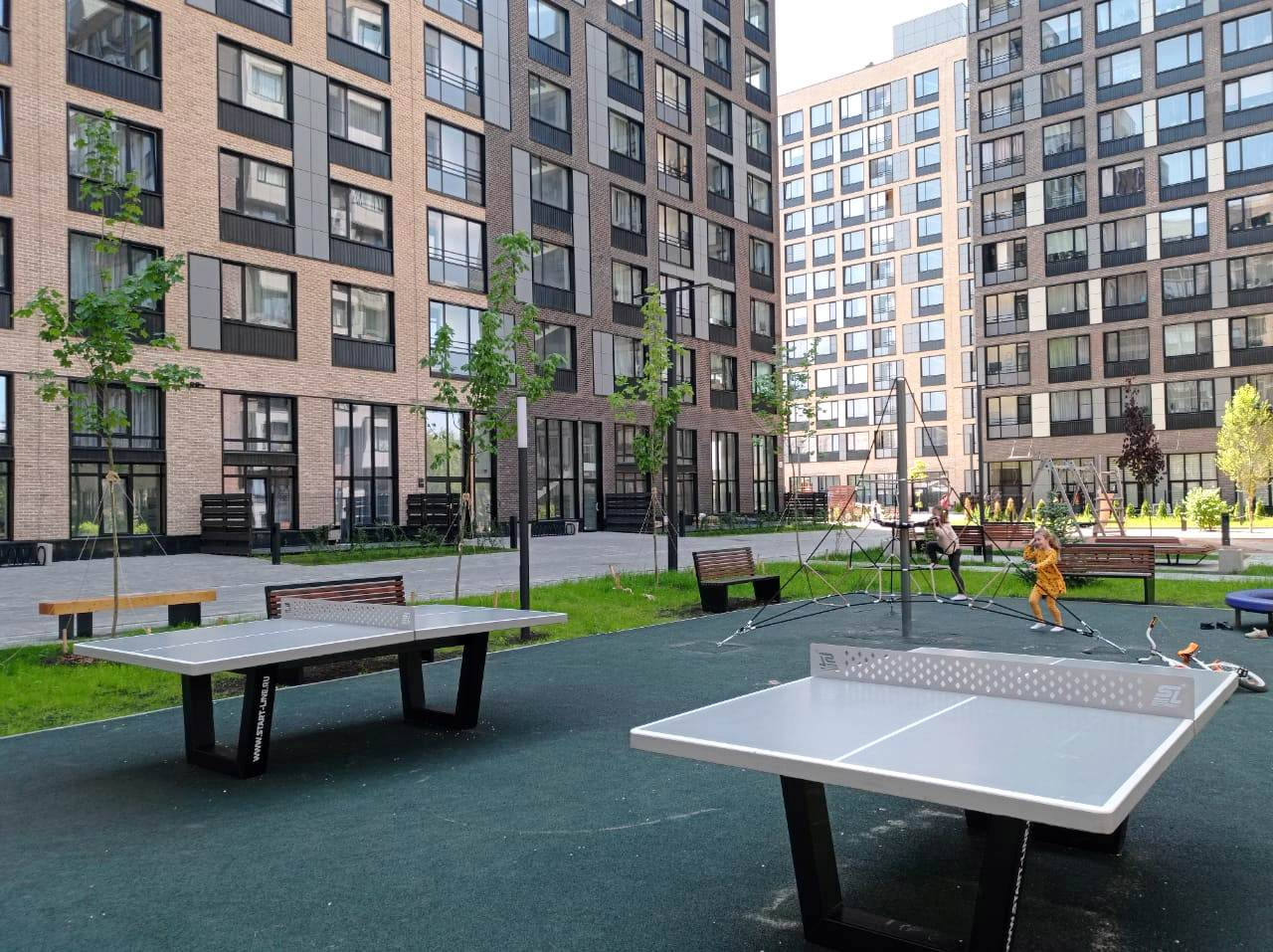 Двор полностью благоустроен: детские площадки, баскетбольное поле, теннисные столы, площадка воркаута, озеленение (газонная трава,кустарники, деревья нескольких пород).