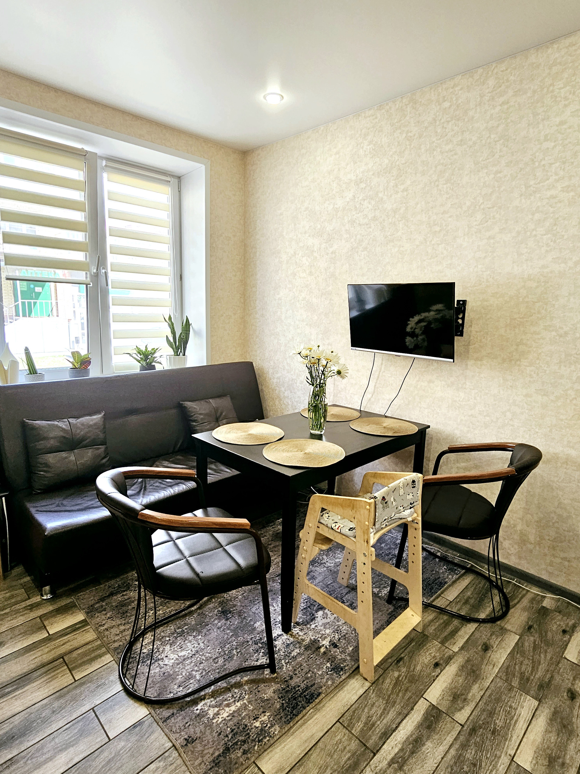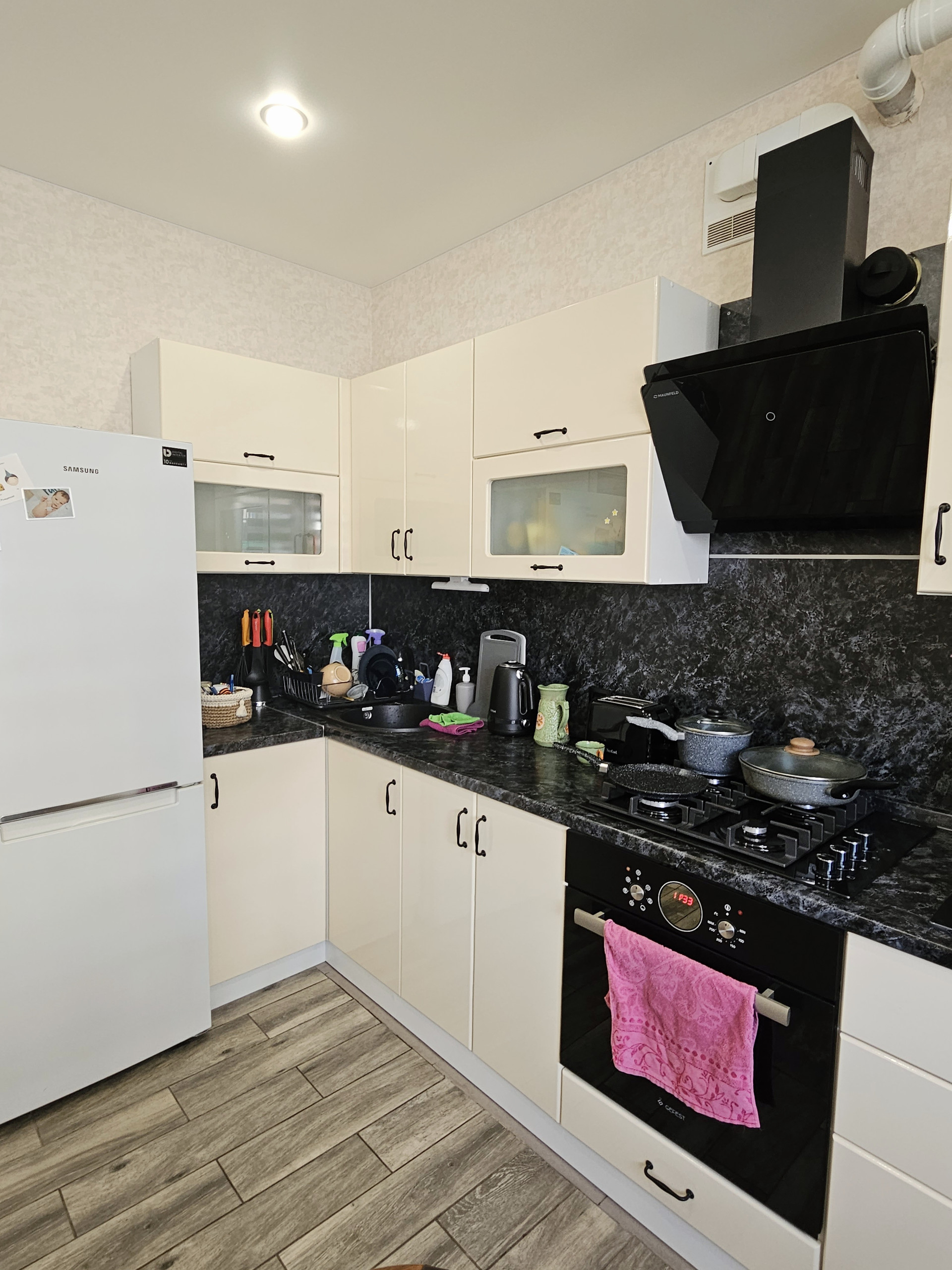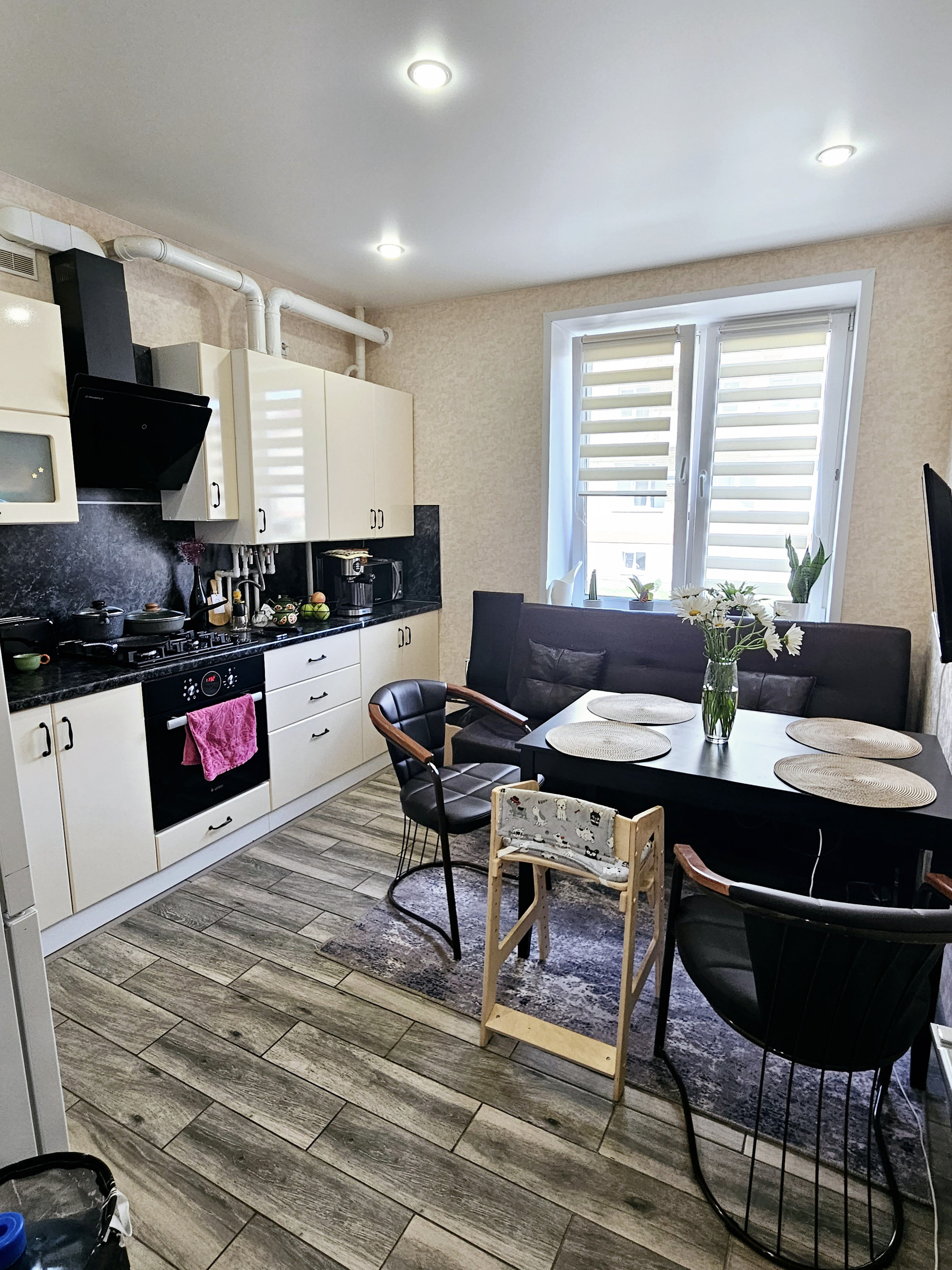 В квартире остаются кухонный гарнитур с техникой (газовая панель, духовой шкаф, вытяжка), шкаф-купе в прихожей и шкаф в детской комнате. Остальная мебель по договорённости.