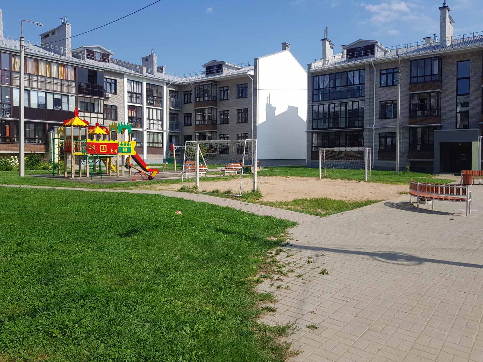 Большая дворовая детская площадка с тренажерами. Закрыта для въезда машин - безопасно для игр детей.